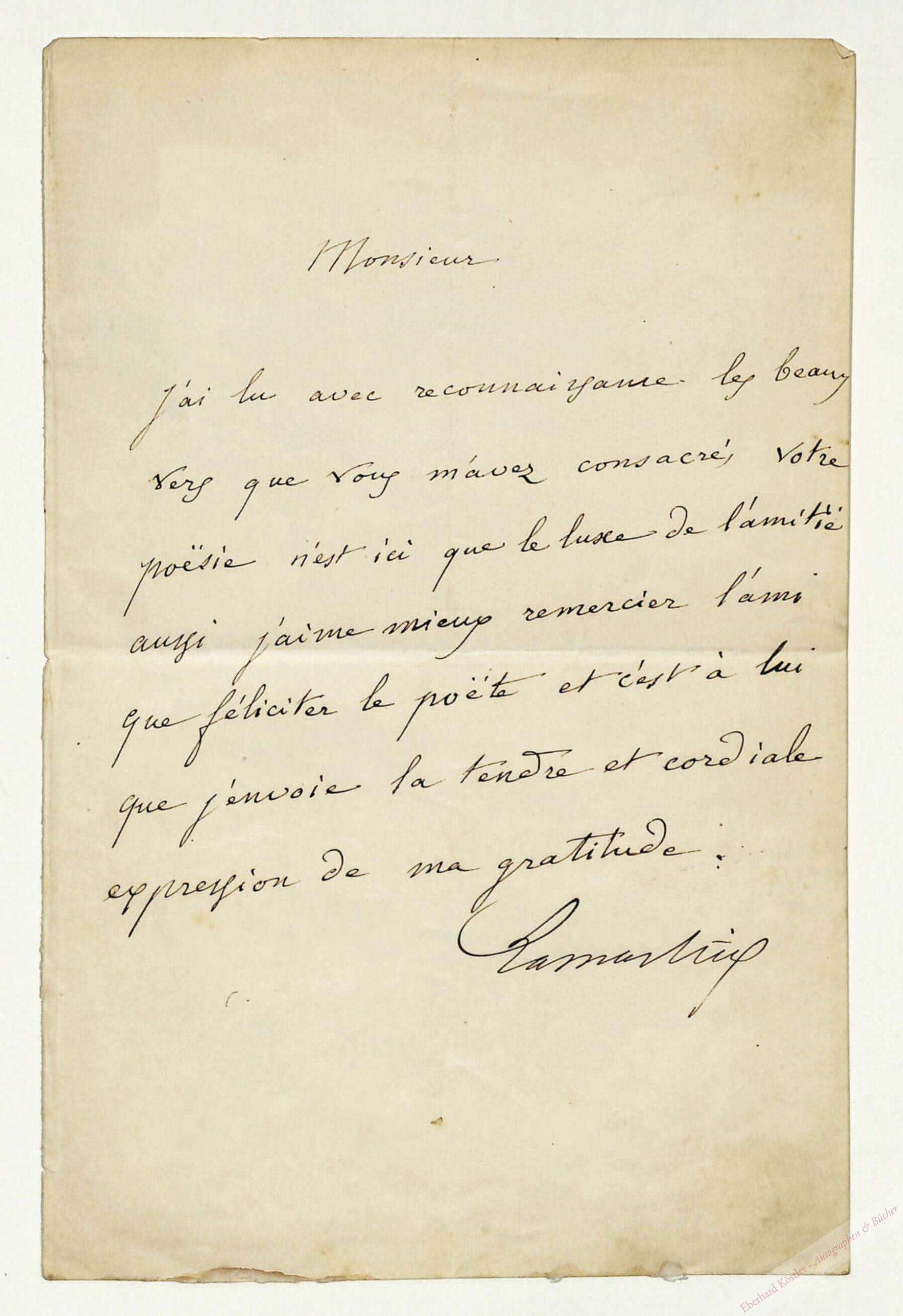 An einen Schriftstellerkollegen wegen eines Huldigungsgedichtes: „[…] J’ai lu avec reconnaissance les beaux vers que vous m’avez consacré, votre poësie n’est ici que le luxe de l’amitié aussi j’aime mieux remercier l’ami que le poëte et c’est à lui que j’envoie le tendre et cordiale expression de ma gratitude […]“ – Gering fleckig. – Beiliegend eine Photographie, die möglicherweise den Dichter zeigt.
