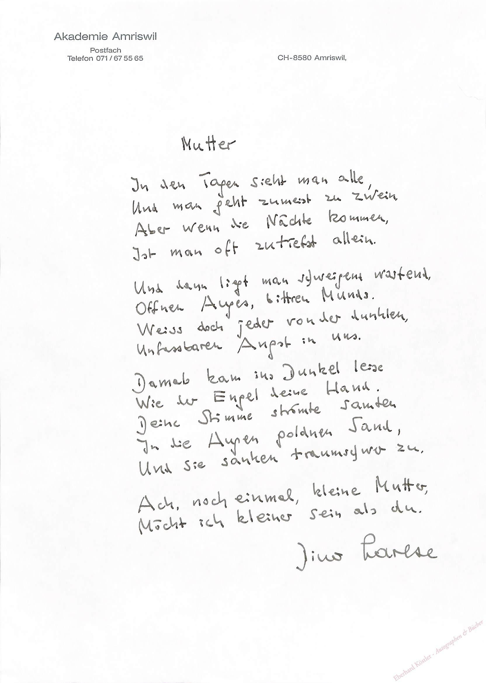 „Mutter || In den Tagen sieht man alle, | Und man geht zumeist zu zwein | Aber wenn die Nächte kommen, | Ist man oft zutiefst allein. | Und dann liegt man schweigent wartend, | Offnen Auges, bittren Munds. | Weiss doch jeder von der dunklen, | Unfassbaren Angst in uns […]“ – Larese gilt als einer der wichtigsten Kulturschaffenden des Bodenseeraums. – Eigenh. Kärtchen liegt bei: „Ist es so recht?“