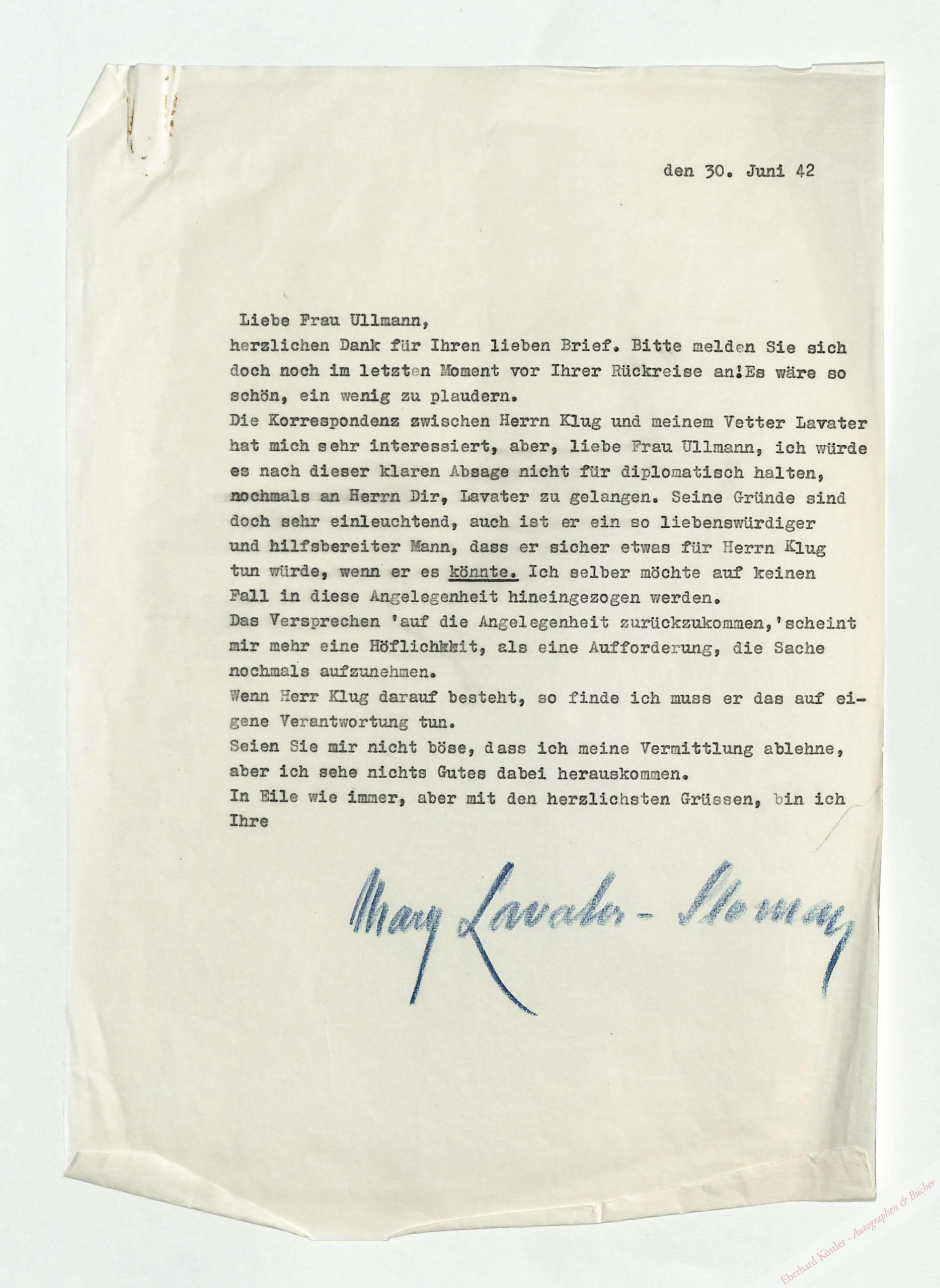 An Regina Ullmann: „[…] Die Korrespondenz zwischen Herrn Klug [Klarinettist und Dirigent] und meinem Vetter Lavater hat mich sehr interessiert, aber […] ich würde es nach dieser klaren Absage nicht für diplomatisch halten, nochmals an Herrn Dir. Lavater zu gelangen. Seine Gründe sind doch sehr einleuchtend […]“