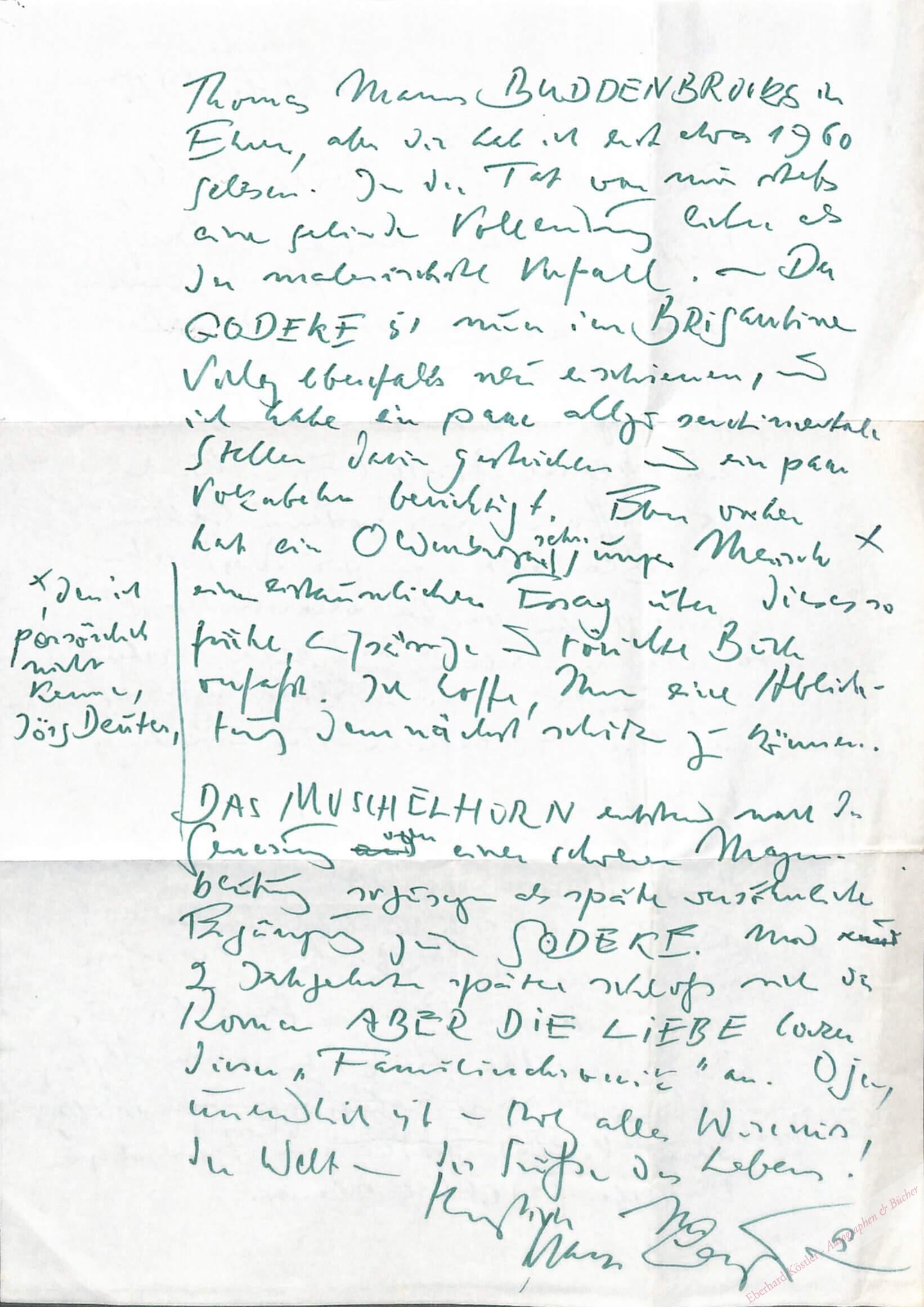 An Pfarrer Karl Rühl: „… Dank für Ihren rührenden Brief vom vom 3. X., den ich gleich beantwortete, nachdem meine Frau Kathrin & ich gestern von reiner Reise genNord zurückgekehrt sind. Es war eine kleine Ausstellung in Kiel zu eröffnen & sodann haben wir Blankenese und die nordseeküste wiedergesehen, was bei wechselndem Wetter wunderbare Eindrücke ergeben hat, trotz meines Alters unschwer bewilligt … Thomas Manns Buddenbrooks in Ehren, aber die habe ich erst etwa 1960 gelesen. In der Tat war mir stets eine gesunde Vollendung lieber als der nebensächlichste Unfall. – Der Godeke ist … ebenfalls neu erschienen, und ich habe ein paar allzu sentimentale Stellen gestrichen. Und ein paar Vokabeln berichtigt …“.