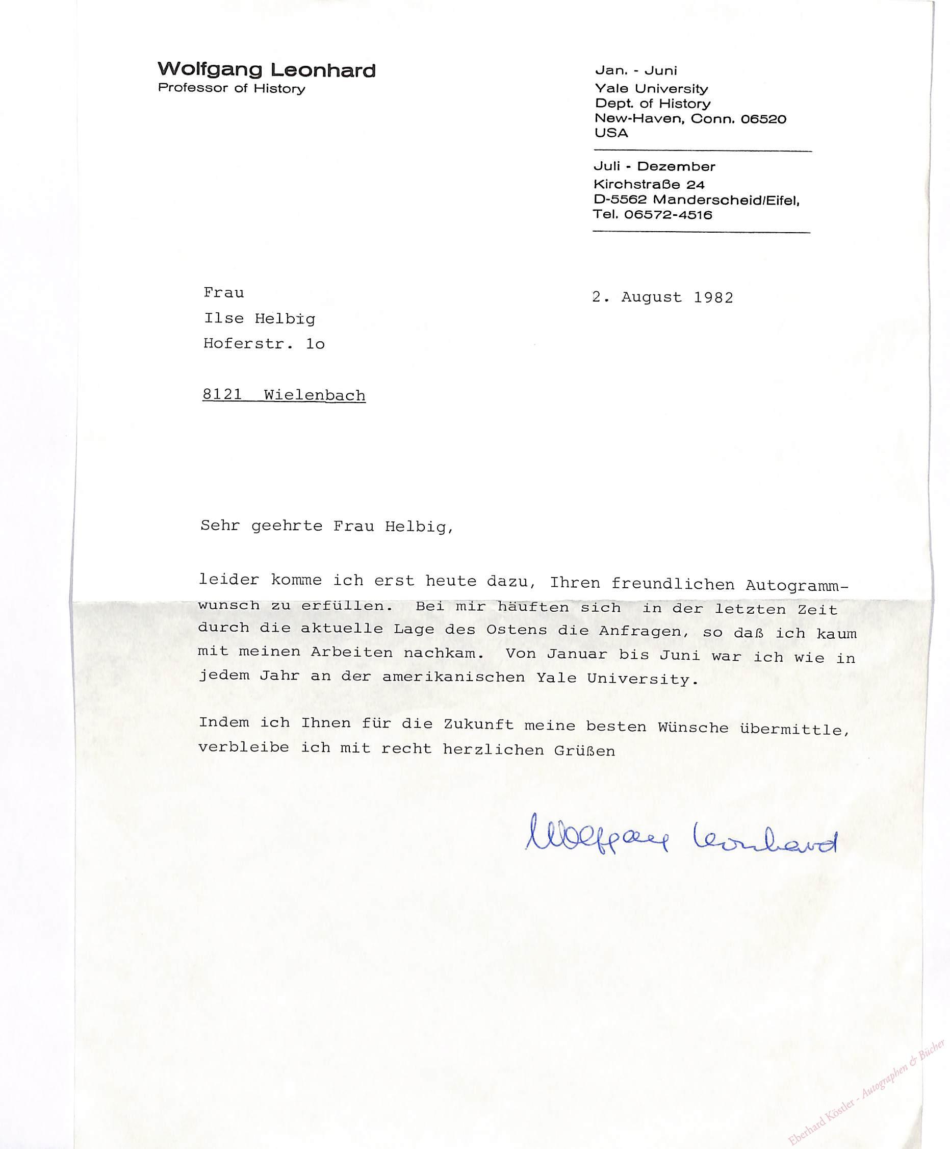 An eine Sammlerin: „[…] Bei mir häuften sich in der letzten Zeit durch die aktuelle Lage des Ostens die Anfragen, so daß ich kaum mit meinen Arbeiten nachkam. Von Januar bis Juni war ich wie in jedem Jahr an der amerikanischen Yale University […]“ – Leonhard war Mitglied der Gruppe Ulbricht und wurde bekannt durch seinen Bestseller „Die Revolution entläßt ihre Kinder“.