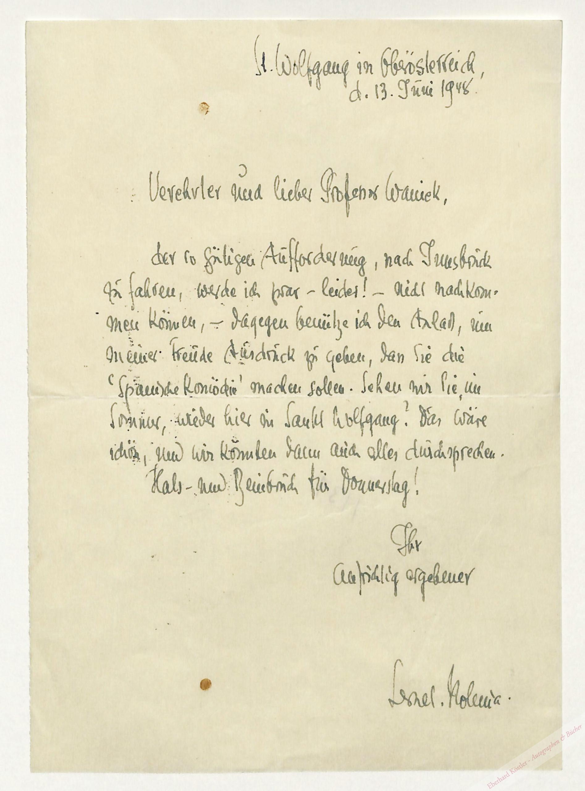 An den Burgtheater-Regisseur Herbert Waniek (1897-1949) mit Absage und Einladung nach St. Wolfgang: „[…] dagegen benütze ich den Anlaß, meiner Freude Ausdruck zu geben, dass Sie die ‚Spanische Komödie‘ [von Lernet-Holenia, 1948] machen sollen […]“