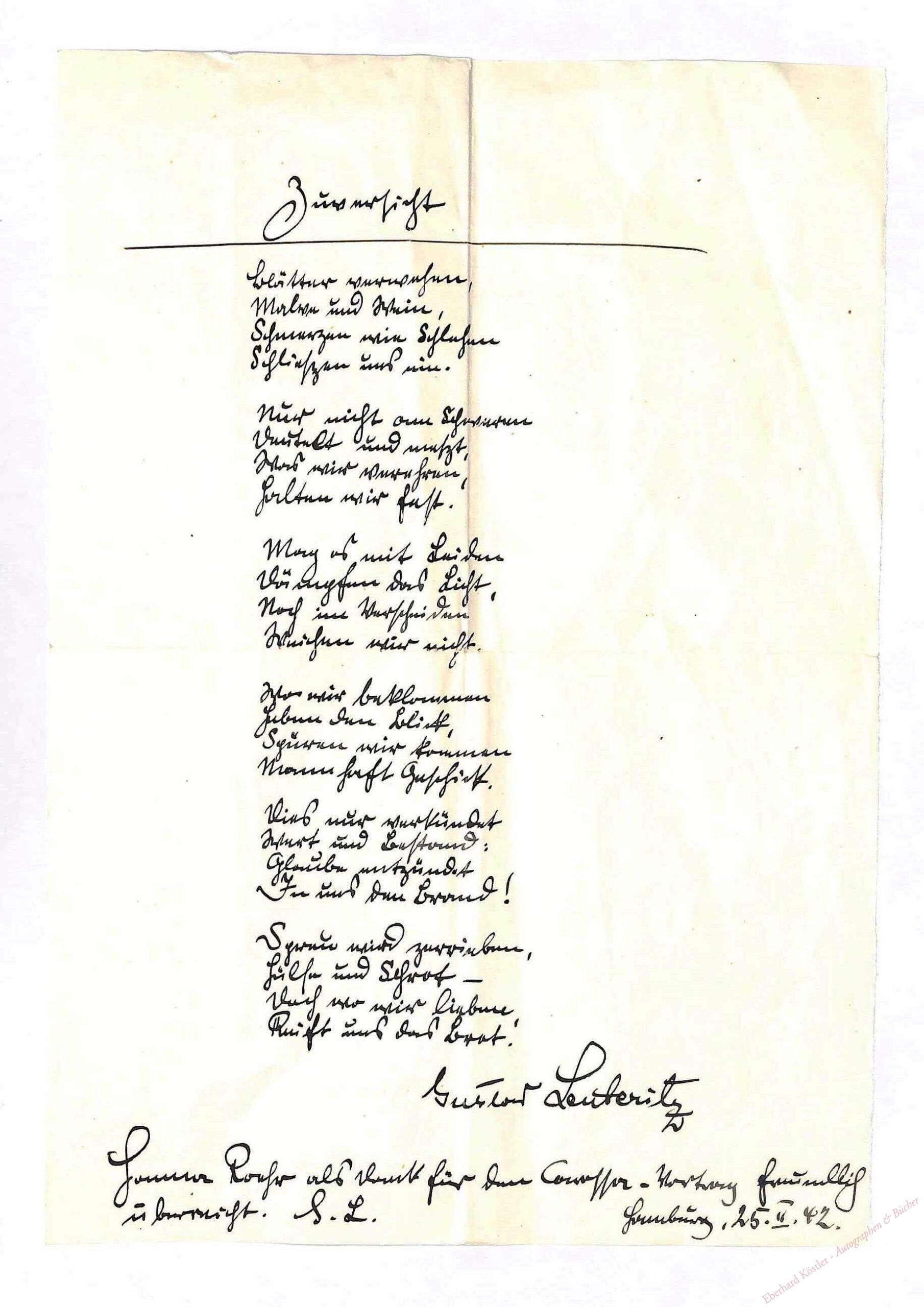 „Zuversicht | Blätter verwehen, | Malven und Wein, | Schmerzen wie Schlehen | Schließen uns ein […]“. – Über Leuteritz ist fast nichts bekannt. Der gebürtige Dresdner war Buchdrucker, Journalist und Redakteur in Hamburg, Mitglied der SPD, verschollen im Lager Workuta. – Vgl. Kosch IX, 1325f.