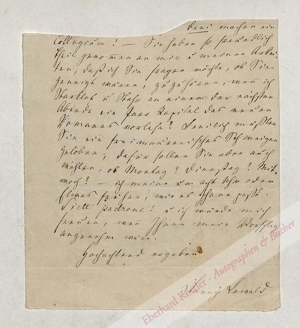 Oberrand mit Datierung und Anrede wahrscheinlich abgeschnitten: „Drei machen ein Collegium! – Sie haben so freundlich Theil genommen an mir und meinen Arbeiten, daß ich Sie fragen möchte, ob Sie geneigt wären, zuzuhören, wenn ich Starklof und Stahr an einem der nächsten Abende ein Paar Kapitel des neuen Romans vorlese? Freilich müßten Sie ein freimaurerisches Schweigen geloben; dafür sollen Sie aber auch wählen, ob Montag? Dienstag? Mittwoch? – ich meine um acht Uhr oder Etwas früher, wie es Ihnen paßt. Siete padrone! und ich würde mich freuen, wenn Ihnen mein Vorschlag angenehm wäre […]“ – Die Erwähnten sind die Schriftsteller Ludwig Starklof (1789-1850) und Adolf Stahr (1805-1876).