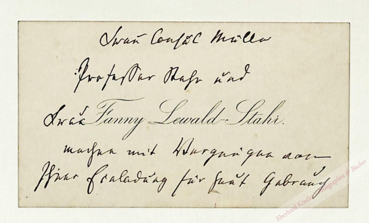Druck: „Fanny Lewald-Stahr“ mit eigenh. Zusage an Frau Konsul Müller, zusammen mit ihrem Mann deren Einladung anzunehmen.