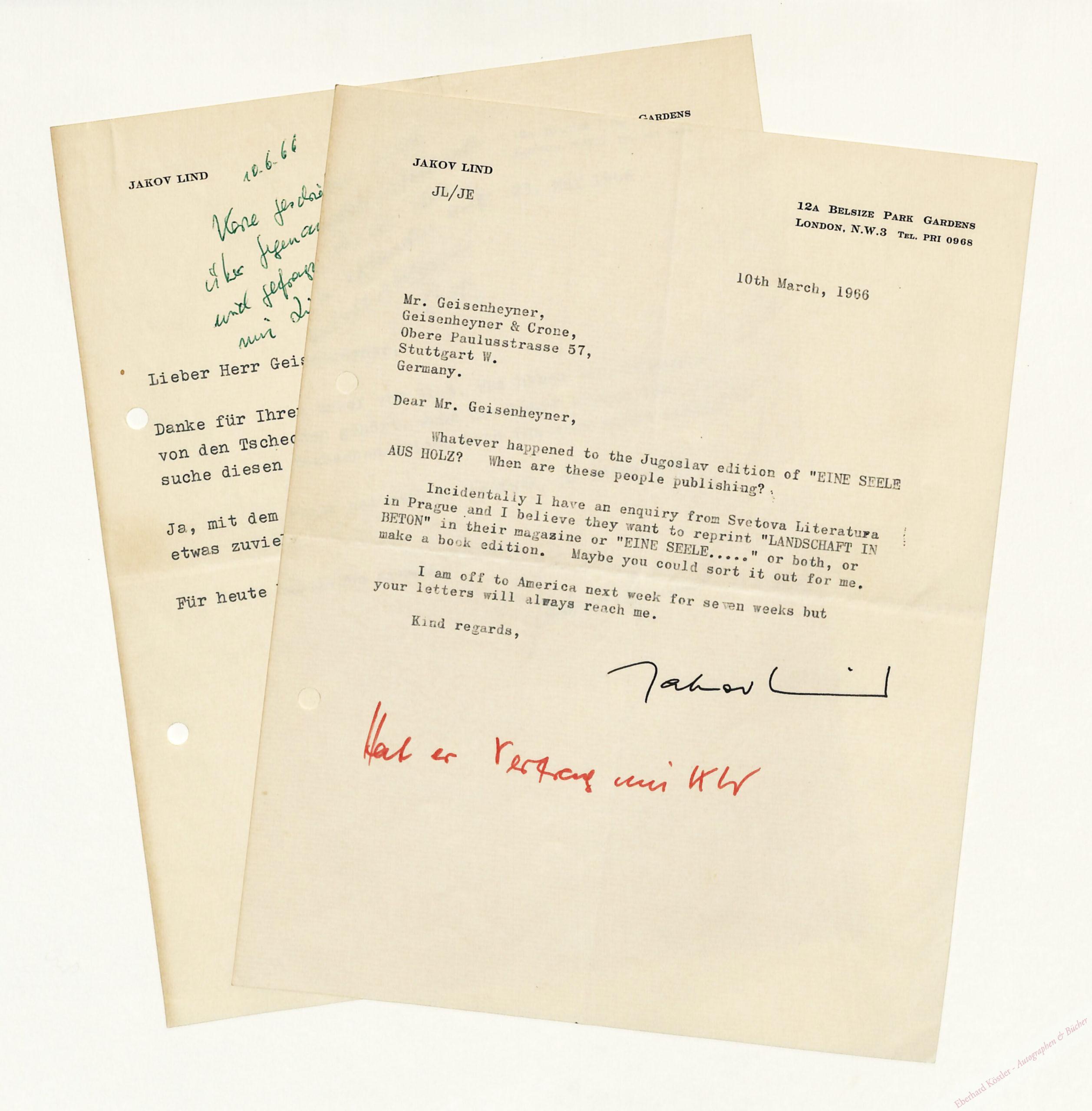 An eine Literaturagentur in Englisch und Deutsch wegen jugoslawischer und tschechischer Ausgaben von „Eine Seele aus Holz“ und „Landschaft in Beton“. – Beantwortungsvermerke des Empfängers. – Linds erste Buchveröffentlichung im deutschsprachigen Raum war 1962 der Erzählungsband „Eine Seele aus Holz“, in dem er Erlebnisse der Emigrationszeit verarbeitet. Darufhin wuder er auch zur Gruppe 47 eingeladen.