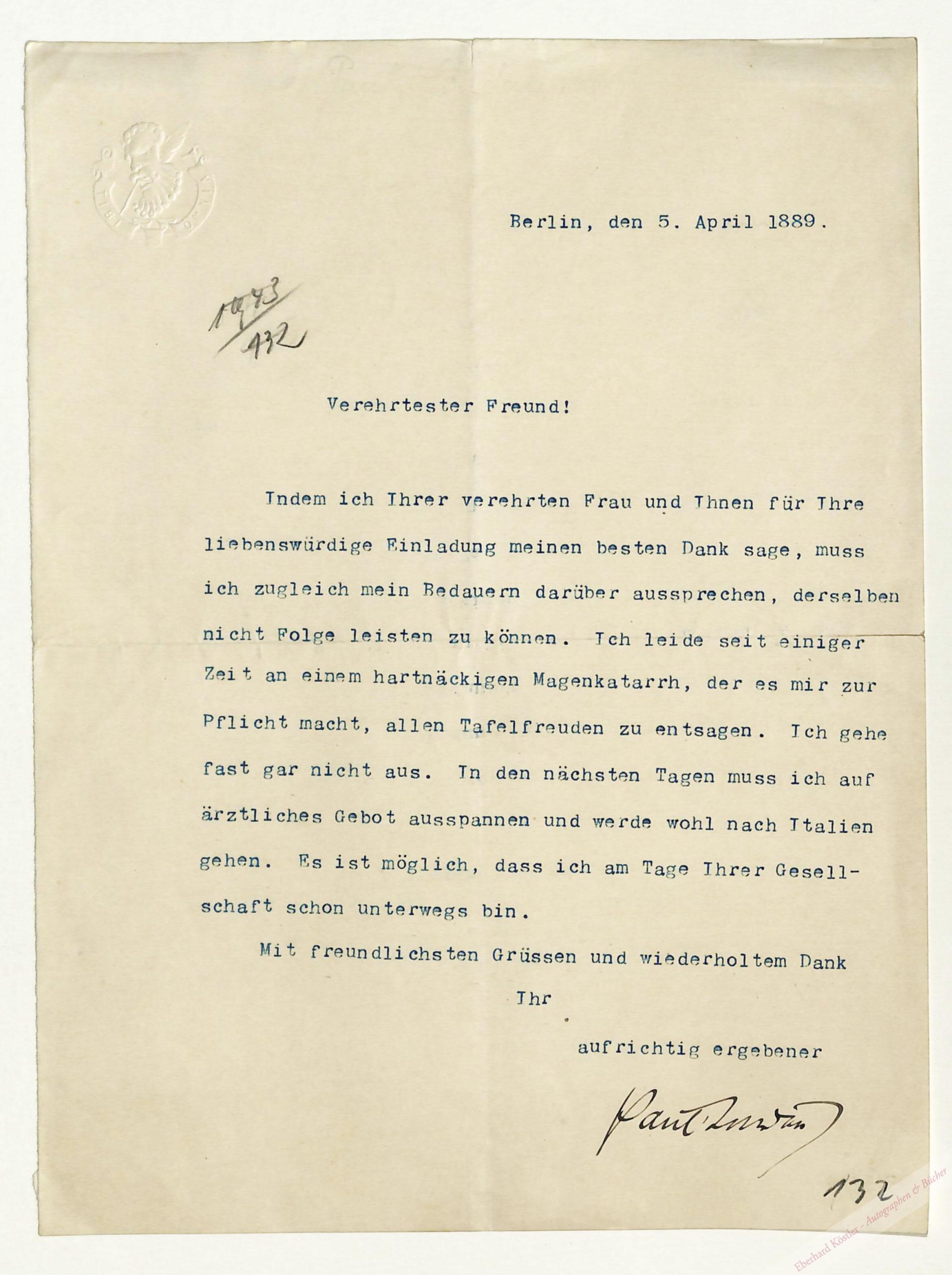 An einen Freund. Absage einer Einladung wegen Magenkatarrh.