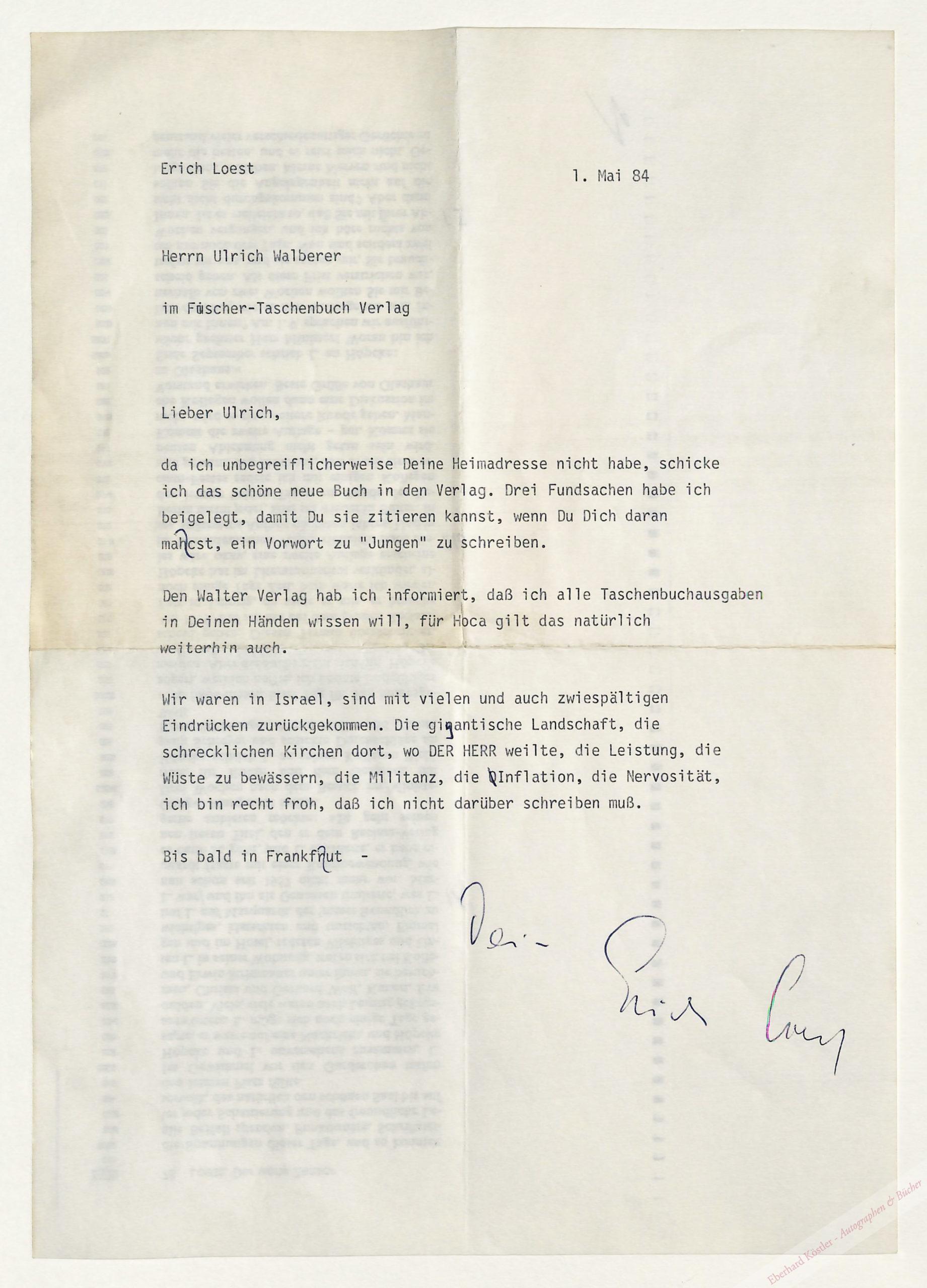 An einen Verleger (auf einem Makulaturblatt) mit Übersendung eines Buches sowie wegen Taschenbuchausgaben: „[…] Wir waren in Israel, sind mit vielen und auch zwiespältigen Eindrücken zurückgekommen. Die gigantische Landschaft, die schrecklichen Kirchen dort, wo DER HERR weilte, die Leistung, die Wüste zu bewässern, die Militanz, die Inflation, die Nervosität, ich bin recht froh, daß ich darüber nicht schreiben muß […]“