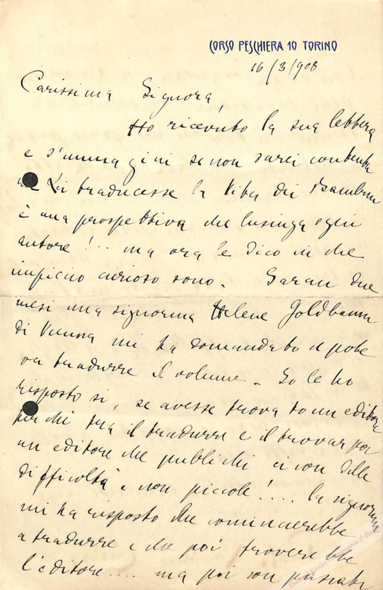 An Lolo Wedekind (geb. Ganghofer) wegen Übersetzungen ihrer Werke ins Deutsche. Erwähnt ihre Novellensammlung „Kodak“ (1898) und ihre Kollegin Ellen Key. – Beilage: Clarice Tartufari (1868-1933). Eigenh. Postkarte mit U. Rom, 19. V. 1909.