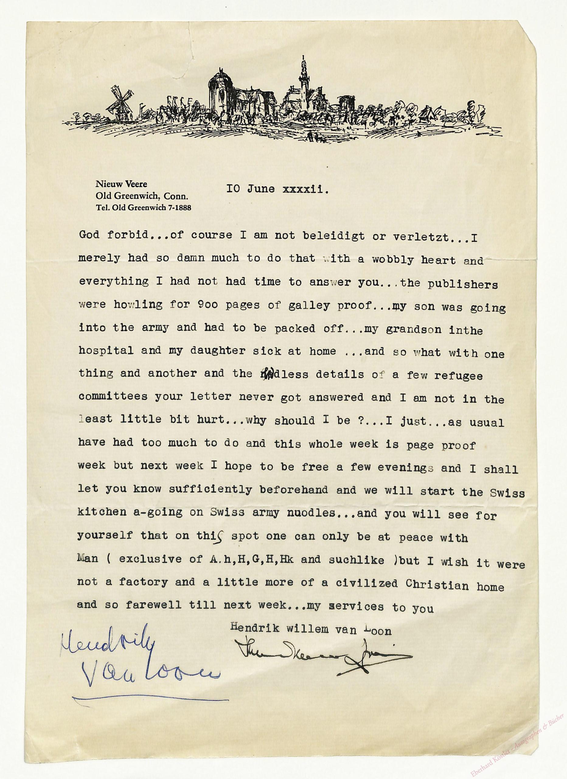 Englisch an den Schriftsteller Paul Elbogen über seine Arbeitsüberlastung. – Loon verfasste zahlreiche populäre Sachbücher. Er half Zuckmayer und zahlreichen anderen europäischen Emigranten.