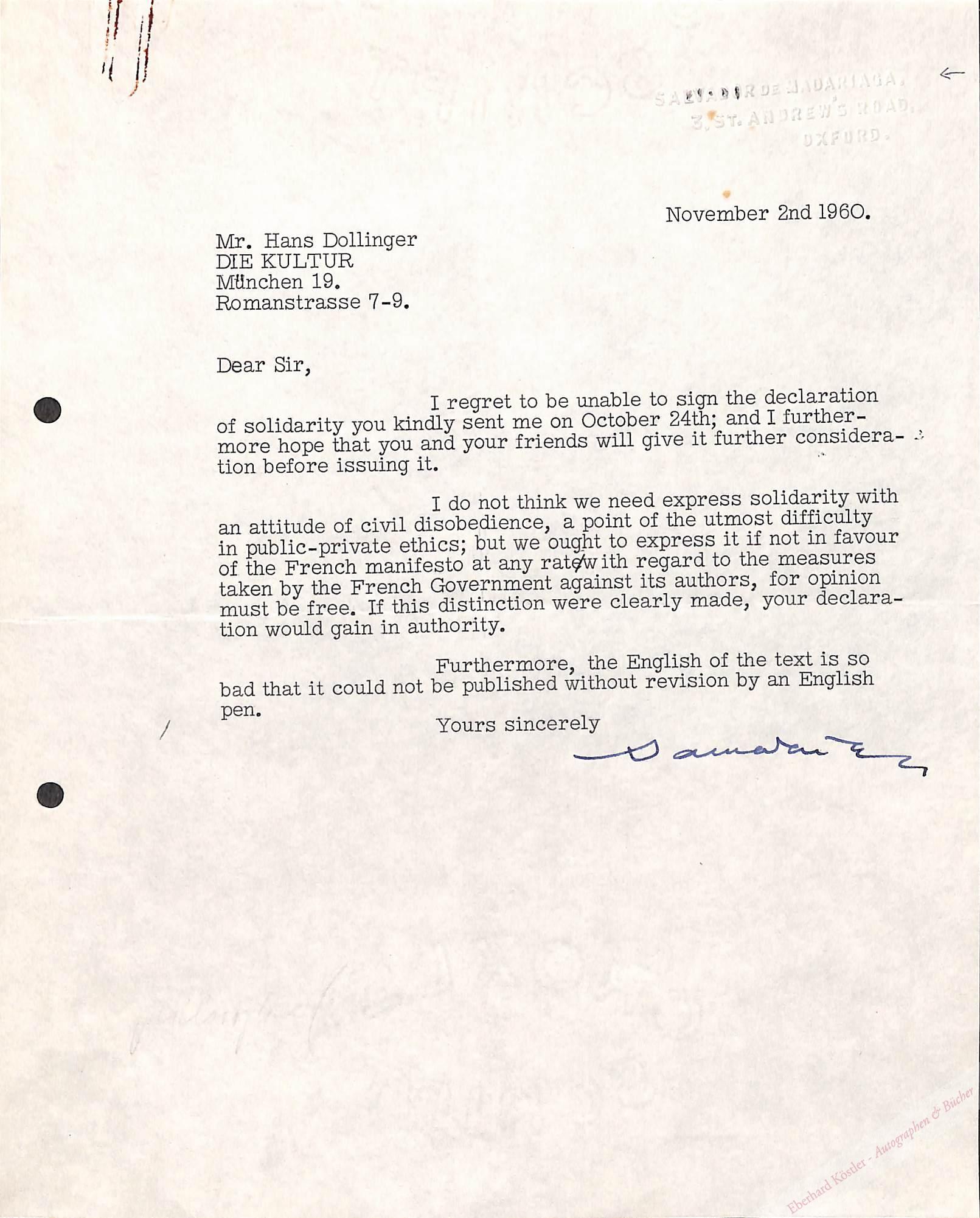 An Hans Dollinger: „… I regret to be unable to sign the declaration of solidarity you kindly sent me on October 24th, and I furthermore hope that you and your friends will give it further consideration before issuing it. I do not think we need express solidarity with an attitude of civil disobedience, a point of the utmost difficulty in public-private ethics; but we ought to express it if not in favour of the French manifesto at any rate with regard to the measures taken by the French Government against its authors, for opinion must be free …“