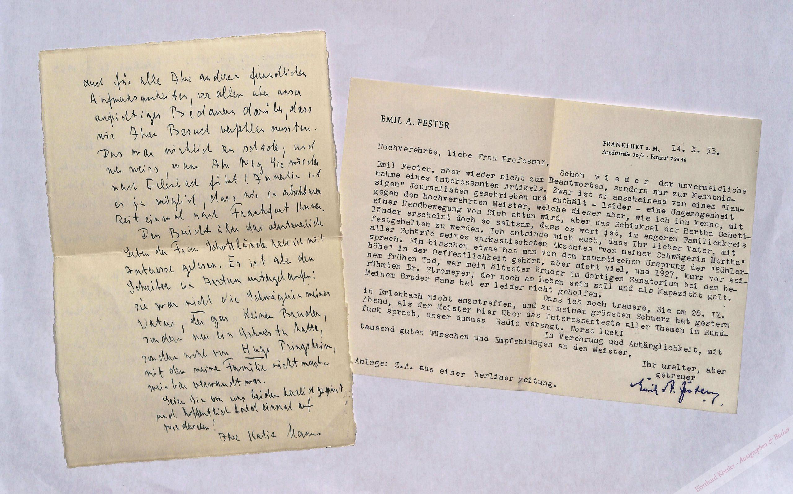 An Emil August Fester (1877-1974) in Frankfurt am Main, dem sie für Glückwünsche zum 70. Geburtstag dankt: „[…] Nun liegt der Tag ja schon wieder erschreckend weit zurück – der Achtzigste nähert sich bereits – und für Danksagungen ist es wohl schon zu spät. Aber ich möchte es doch nicht unterlassen, Ihnen meine herzliche Erkenntlichkeit auszudrücken, auch für alle Ihre guten, freundlichen Aufmerksamkeiten. vor allem unser aufrichtiges Bedauern darüber, dass wir Ihren Besuch verfehlen mussten […] Den Bericht über das abenteuerliche Leben der Frau Schottländer habe ich mit Interesse gelesen. Es ist aber dem Schreiber ein Irrtum untergelaufen: sie war nicht die Schwägerin meines Vaters [Alfred Pringsheim], der gar keinen Bruder, sondern nur eine Schwester [Martha] hatte, sondern wohl von Hugo Pringsheim, mit dem meine Familie nicht nachweisbar verwandt war […]“ – Beiliegend ein masch. Gegenbrief von Emil August Fester (Frankfurt, 14. X. 1953, Qu.-8°, 1 Seite). – Der Mathematiker und Kunstmäzen Alfred Pringsheim (1850-1941) war das erste Kind und der einzige Sohn des oberschlesischen Eisenbahnunternehmers und Kohlengrubenbesitzers Rudolf Pringsheim (1821-1906) und seiner Frau Paula (1827-1909). Seine Schwester Martha (1951-1921) war mit dem Gutsbesitzer Paul von Röhrscheidt (1847-1916) verheiratet. – Der Gutsbesitzer Hugo Pringsheim (1845-1915) aus Breslau war ein entfernter Verwandter der Münchener Familie Pringsheim und verheiratet mit Hedwig Pringsheim-Heymann. – Hertha Schottländer (geb. Isenbart, 1871-1918) war mit Hugo Pringsheims verheiratet gewesen und ließ sich von ihm scheiden. 1911 ließ sie auf der Bühler Höhe ein Sanatorium erbauen, das später zum Hotel wurde. – Emil August Fester war ein Kinder- und Jugendfreund der Familie Pringsheim. Über seine Zeit in München verfasste er „Münchener Erinnerungen“, die im Typoskript in der Münchener Monacensia erhalten sind: ein wichtiger, bislang unbeachtet gebliebener Quellenbestand zur Geschichte der Familie Pringsheim und zu den Jugendjahren Katia Manns. Der Spross einer Frankfurter Bankiersfamilie wurde in München geboren, wo sein Vater Direktor der Bayerischen Vereinsbank war, und kam mit 13 Jahren nach Frankfurt. Dort absolvierte er eine Kaufmannslehre. 1905 wurde er in das Bankhaus Jakob S. H. Stern berufen, später ging er nach New York zur American Metal Company, arbeitete für Edward D. Adams, dem Präsidenten der Northern-Pacific-Railway und Vertreter der Deutschen Bank. 1909 wurde Fester als Prokurist von der Philipp Holzmann A.G. zum Bau der Bagdad-Bahn übernommen.