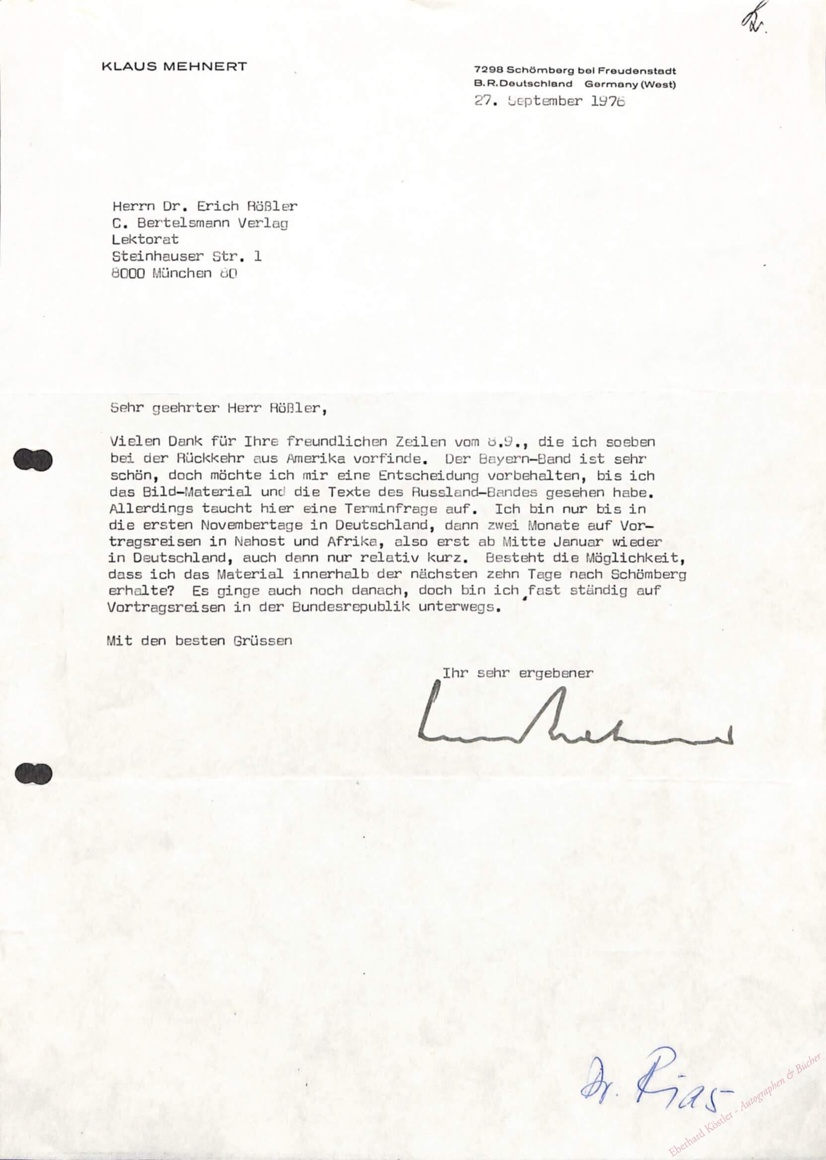 An Erich Hößler in München: „[…] Der Bayern-Band ist sehr schön, doch möchte ich mir eine Entscheidung vorbehalten, bis ich das Bild-Material und die Texte des Russland-Bandes gesehen habe.[…]“. – Gelocht.