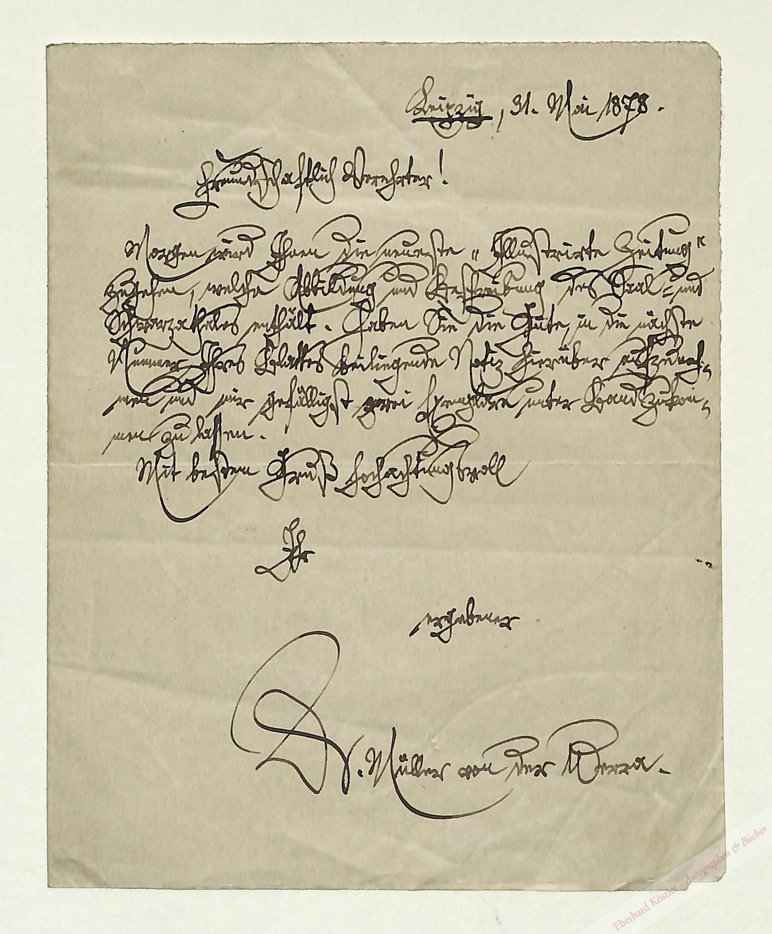 An einen Redakteur: „[…] Morgen wird Ihnen die neueste ‚Illustrierte Zeitung‘ zugehen, welche Abbildung und Beschreibung des Orla- und Schwarzathales enthält. Haben Sie die Güte in der nächsten Nummer Ihres Blattes beiliegende Notiz hierüber aufzunehmen und mir gefälligst zwei Exemplare unter Band zukommen zu lassen […]“ – Der thüringische Dichter Friedrich Konrad Müller wurde 1871Ehrendoktor der Universität Jena.