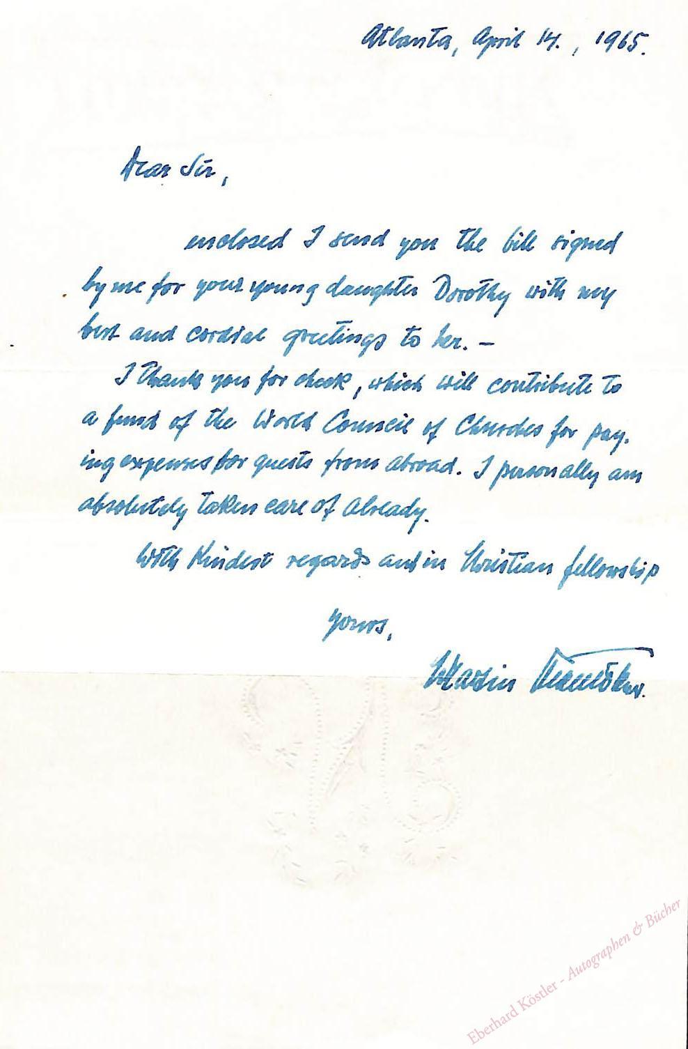 An den Anwalt J. Crespi in Atlanta: „[…] enclosed I send you the bill signed by me for your young daughter Dorothy with my best and cordial greetings to her. – I thank you for check, which will contribute to a fund of the World Council of Churches for paying expenses for quests from abroad. I personally am absolutely taken care of Already. With kindest regards and in Christian fellowship […]“