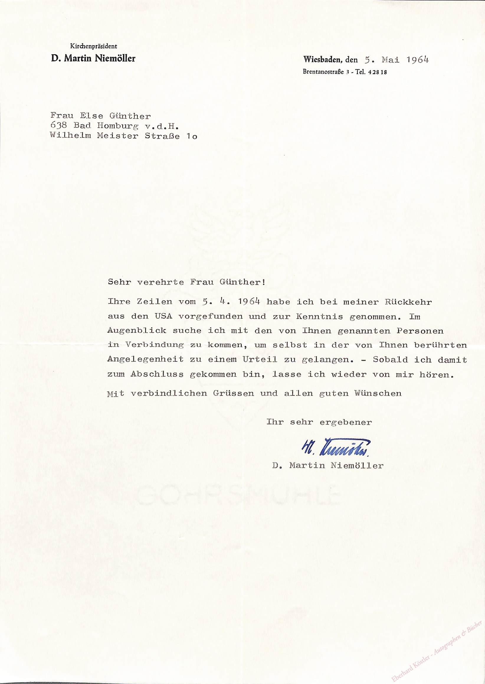 An Else Günther in Bad Homburg v.d.H.: „[…] Ihre Zeilen vom 5. 4. 1964 habe ich bei meiner Rückkehr aus den USA vorgefunden und zur Kenntnis genommen. Im Augenblick suche ich mit den von Ihnen genannten Personen in Verbindung zu kommen, um selbst in der von Ihnen berührten Angelegenheit zu einem Urteil zu gelangen. – Sobald ich damit zum Abschluss gekommen bin, lasse ich wieder von mir hören […]“