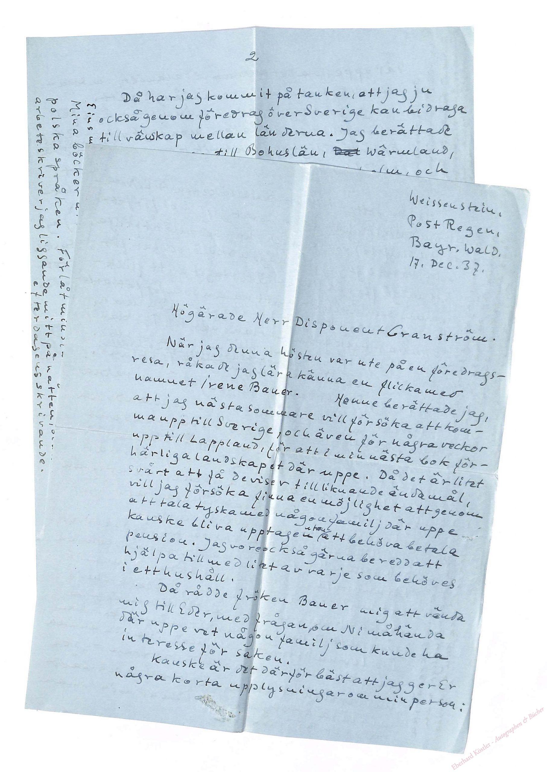 Langer Brief in schwedischer Sprache an Disponent Granström. – Beiliegend: Dieselbe, Roger Björn. Roman. Stuttgart 1935. 316 S., 2 Bl. OLwd. – Mit eigenh. Widmung für denselben. – Marianne Wintersteiner, Das Glanzlicht. Clara Nordströms Lebensroman. Heilbronn 1988. – Selten.