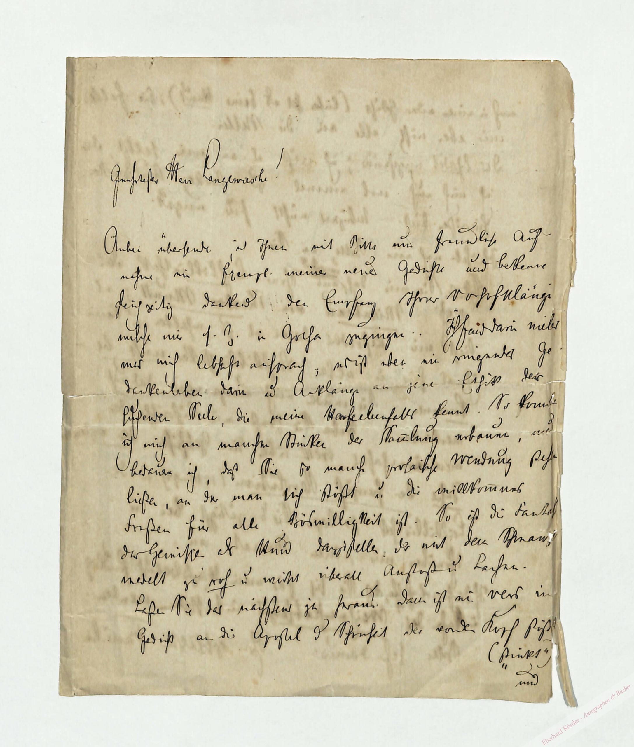 An Wilhelm Langewiesche mit Dank für dessen Gedichtband „Vorhofklänge“ und Übersendung eines Bandes neuer Gedichte, sowie Bestellung von Büchern über französische Geschichte aus der Leihbibliothek. – Olebermann war bei Wilhelm Langewiesche Buchhändlerlehrling und Mitbegründer eines Wuppertaler Dichterkreises. – Randeinrisse.