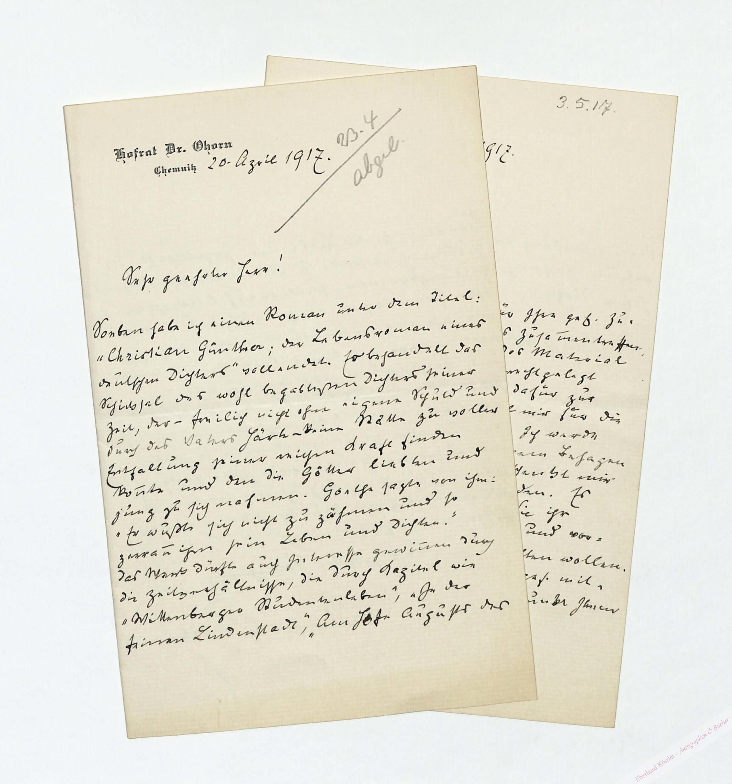 An den Verleger Wilhelm Langewiesche (1866-1934), dem er seinen Roman „Christian Günther; der Lebensroman eines deutschen Dichters“ sowie seine Lebenserinnerungen („Aus Kloster und Welt“; 1919) anbietet.