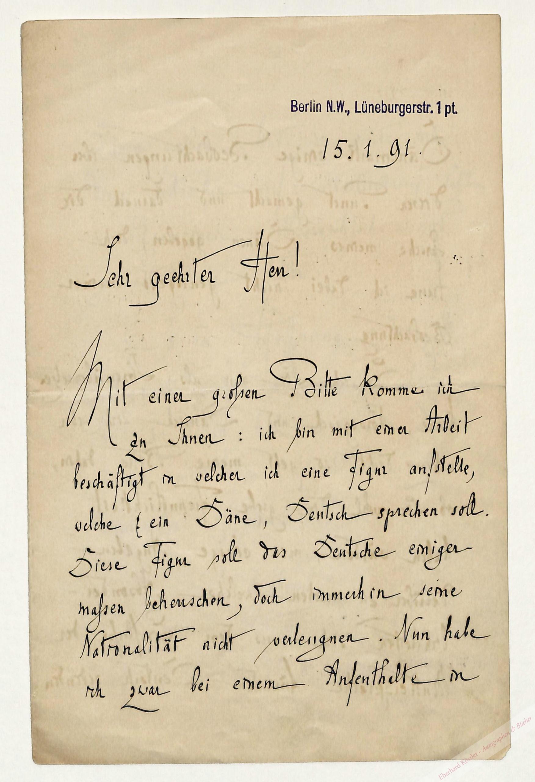An einen Ibsen-Übersetzer: „[…] ich bin in einer Arbeit beschäftigt in welcher ich eine Figur aufstelle, welche ein Däne, Deutsch sprechen soll. Diese Figur soll das Deutsche einigermaßen beherrschen, doch immerhin seine Nationalität nicht verleugnen […]“ Er bitte um Beratung in diesem Punkt. – Faltenrisse.