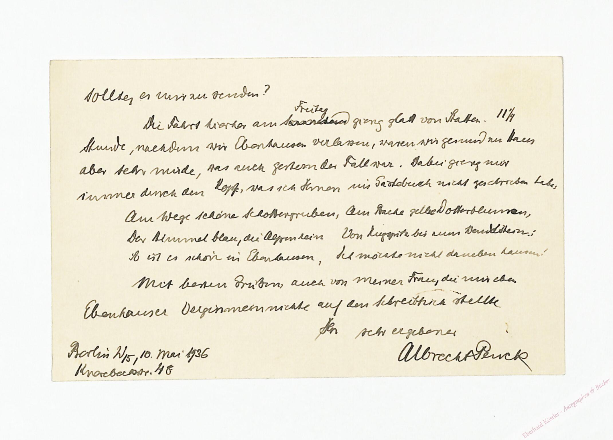 An Helene Langewiesche mit Übersendung seiner Gedanken und Erinnerungen eines Austauschprofessors in USA und wegen verlorener Notizen sowie mit einem Gästebuchvers. – Penck war der bedeutendste deutsche Geograph der ersten Hälfte des 20. Jahrhunderts (NDB).
