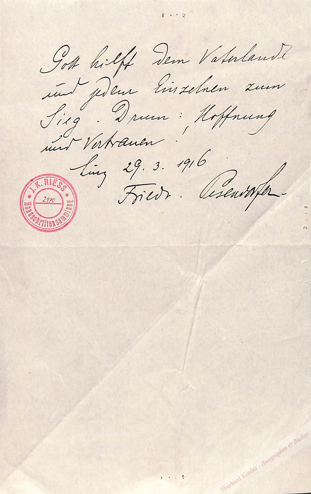 „Gott hilft dem Vaterlande und jedem Einzelnen zum Sieg. Drum: Hoffnung und Vertrauen!“ – Roter Sammlungsstempel auf der Vorderseite.