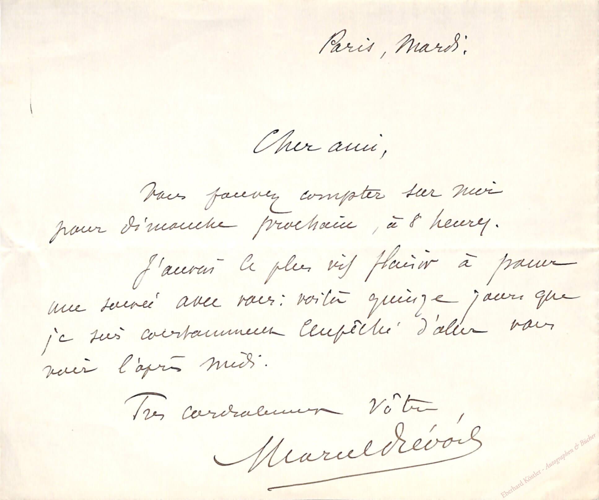 Eigenhändiger Brief mit Unterschrift Paris, ohne Jahr, Qu.-Kl.-4°. 1 Seite. Doppelblatt. – Wegen einer Verabredung..