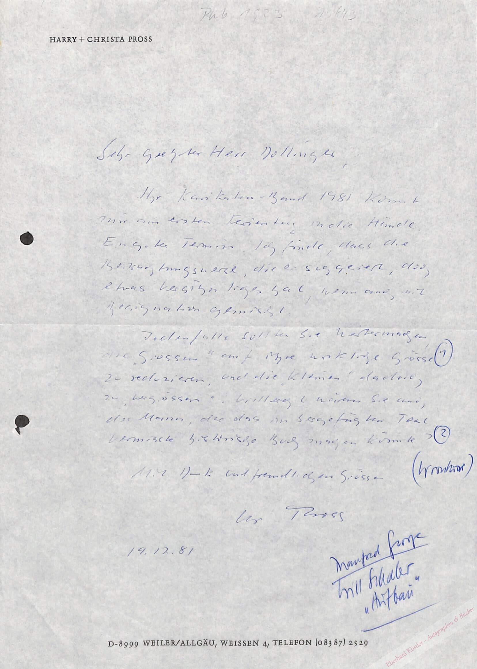 An Hans Dollinger: „… Ihr Karikaton-Band 1981 kommt mir am ersten Feiertag in die Hände. Ein guter Termin. Ich finde, dass die Betrachtungsweise, die er suggestiert, doch etwas Versöhnliches hat, wenn auch mit Resignation gemischt. Jedenfalls sollten Sie weitermachen, die ‚Grossen‘ auf ihre wirkliche Grösse zu reduzieren, und die ‚Kleinen‘ dadurch zu ‚vergrößern‘. Vielleicht wären sie auch der Mann, der das im beigefügten Text vermisste historische Buch machen könnte? […]“. – 1981 erschien „Ein Jahr in der Karikatur“, herausgegeben von Hans Dollinger und Arno Koch.
