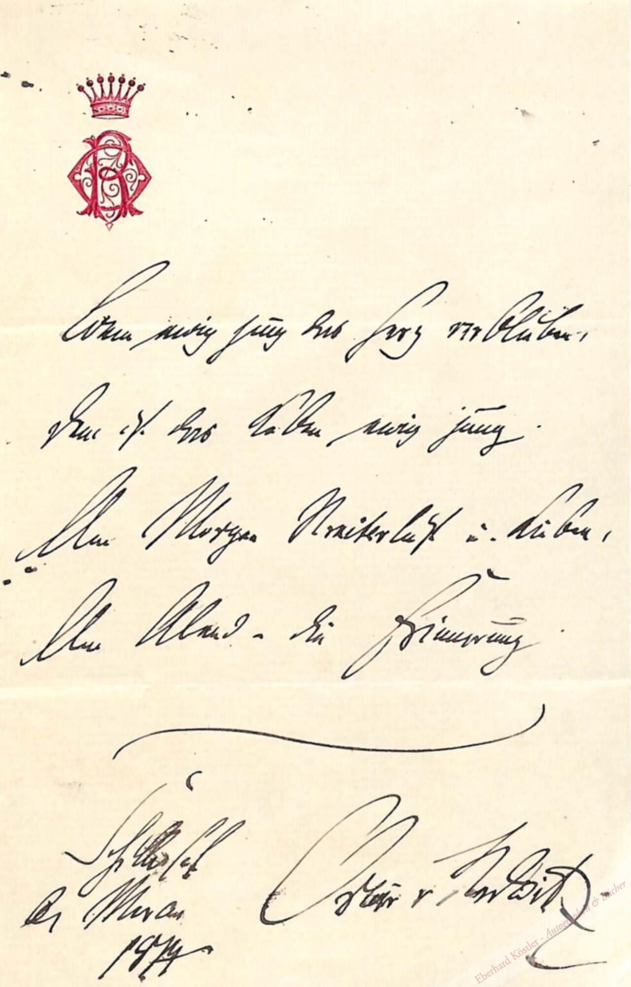 „Wem ewig jung das Herz verblieben, | Dem ist das Leben ewig jung. | Am Morgen Streiterlust und Lieben, | Am Abend die Erinnerung.“ – Beiliegend Faksimiledruck eines Briefes.