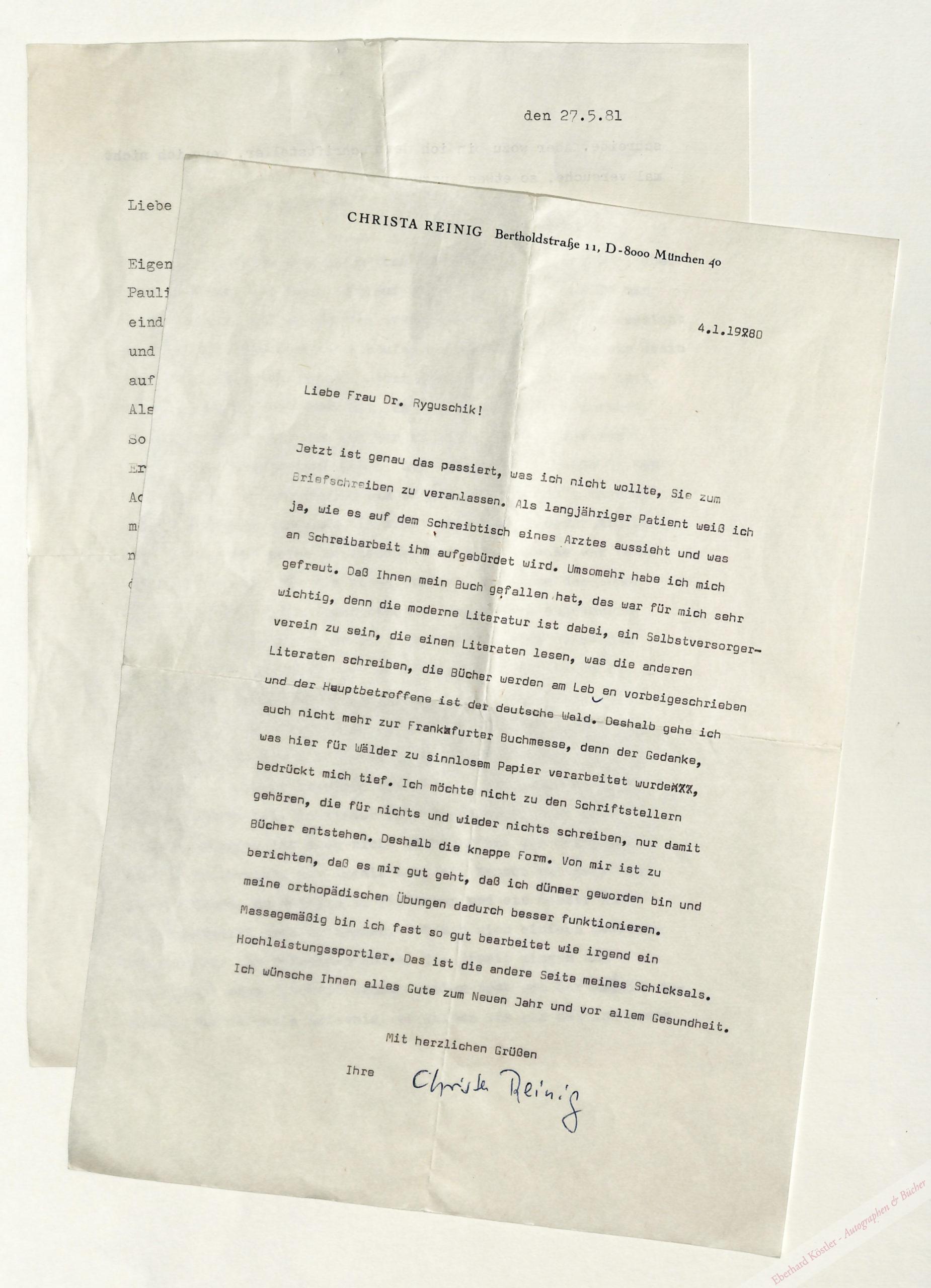 Beide Briefe an die Berliner Ärztin Frau Dr. Ryguschik. – I. „[…] Daß Ihnen mein Buch gefallen hat, das war für mich sehr wichtig, denn die moderne Literatur ist dabei, ein Selbstversorgerverein zu sein, die einen Literaten lesen, was die anderen Literaten schreiben, die Bücher werden am Leben vorbeigeschrieben und der Hauptbetroffene ist der deutsche Wald. Deshalb gehe ich auch nicht mehr zur Frankfurter Buchmesse, denn der Gedanke, was hier für Wälder zu sinnlosem Papier verarbeitet wurden, bedrückt mich tief. Ich möchte nicht zu den Schriftstellern gehören, die für nichts und wieder nichts schreiben, nur damit Bücher entstehen. Deshalb die knappe Form […] Massagemäßig bin ich fast so gut bearbeitet wie irgend ein Hochleistungssportler […]“ – II. Interessante Gedanken über den idealen Hausarzt und seine Tätigkeit. – Christa Reinig litt an Morbus Bechterew. – Knickfalten.