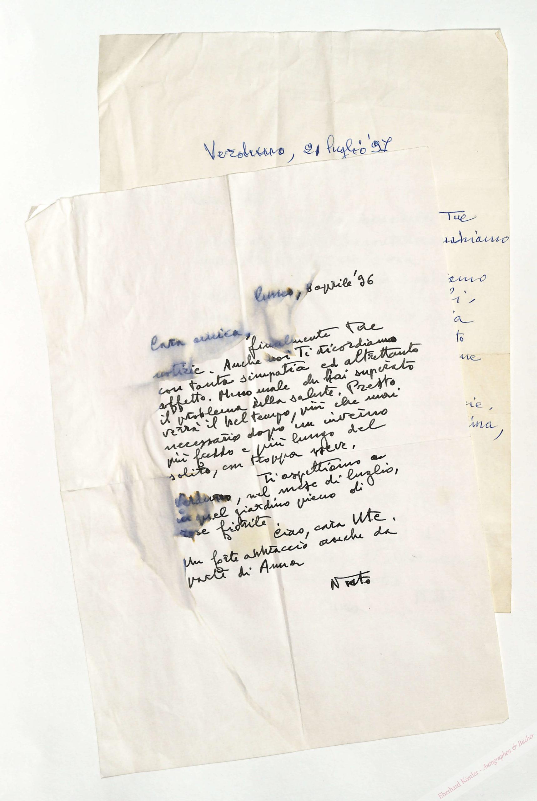 An Ute Stempel in München über Gesundheitsfragen und die deutsche Ausgabe seines Buches „Der verschollene Deutsche“ („Il Disperso di Marburg“). – Knittrig. – Beiliegend ein weiterer Brief, Cuneo, 8. IV. 1996, mit starkem Wasserschaden.