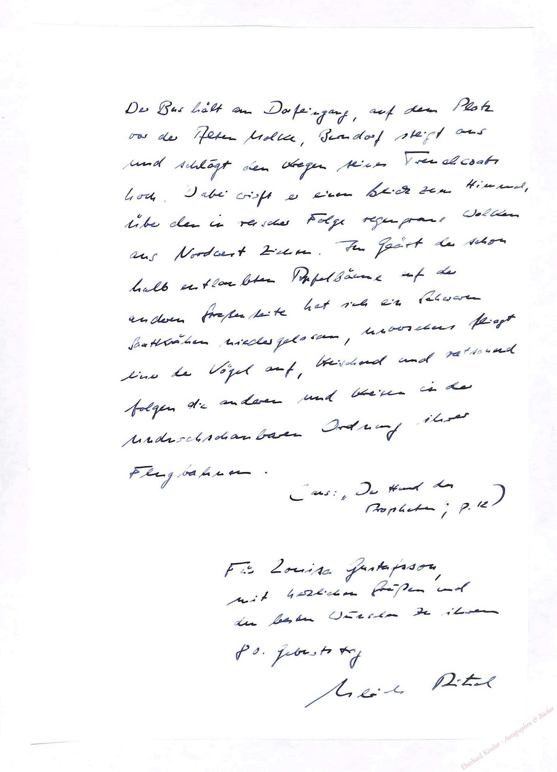 „Der Bus hält am Dorfeingang, auf dem Platz vor der Alten Molke, Berndorf steigt aus und schlägt den Kragen seines Trenchcoats hoch […]“. Aus „Der Hund des Propheten“, erschienen 2003 im Libelle Verlag.