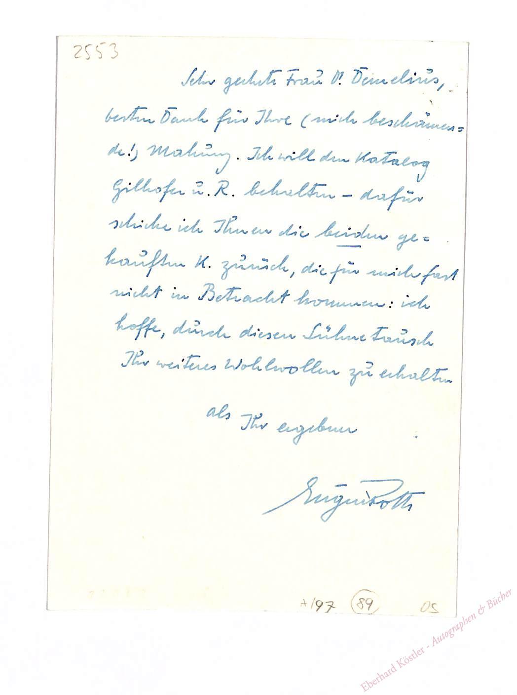 An das Antiquariat V. A. Heck in Wien wegen Katalogen, u. a. von Gilhofer und Ranschburg und einer Rücksendung als „Sühnetausch“.