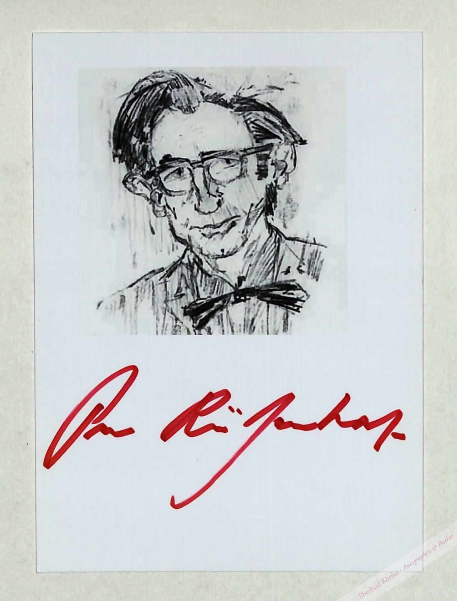Porträtpostkarte mit eigenhändiger Unterschrift in rotem Filzstift. , Ohne Ort und Jahr, 1 Seite. – Nach einer Porträtzeichnung..