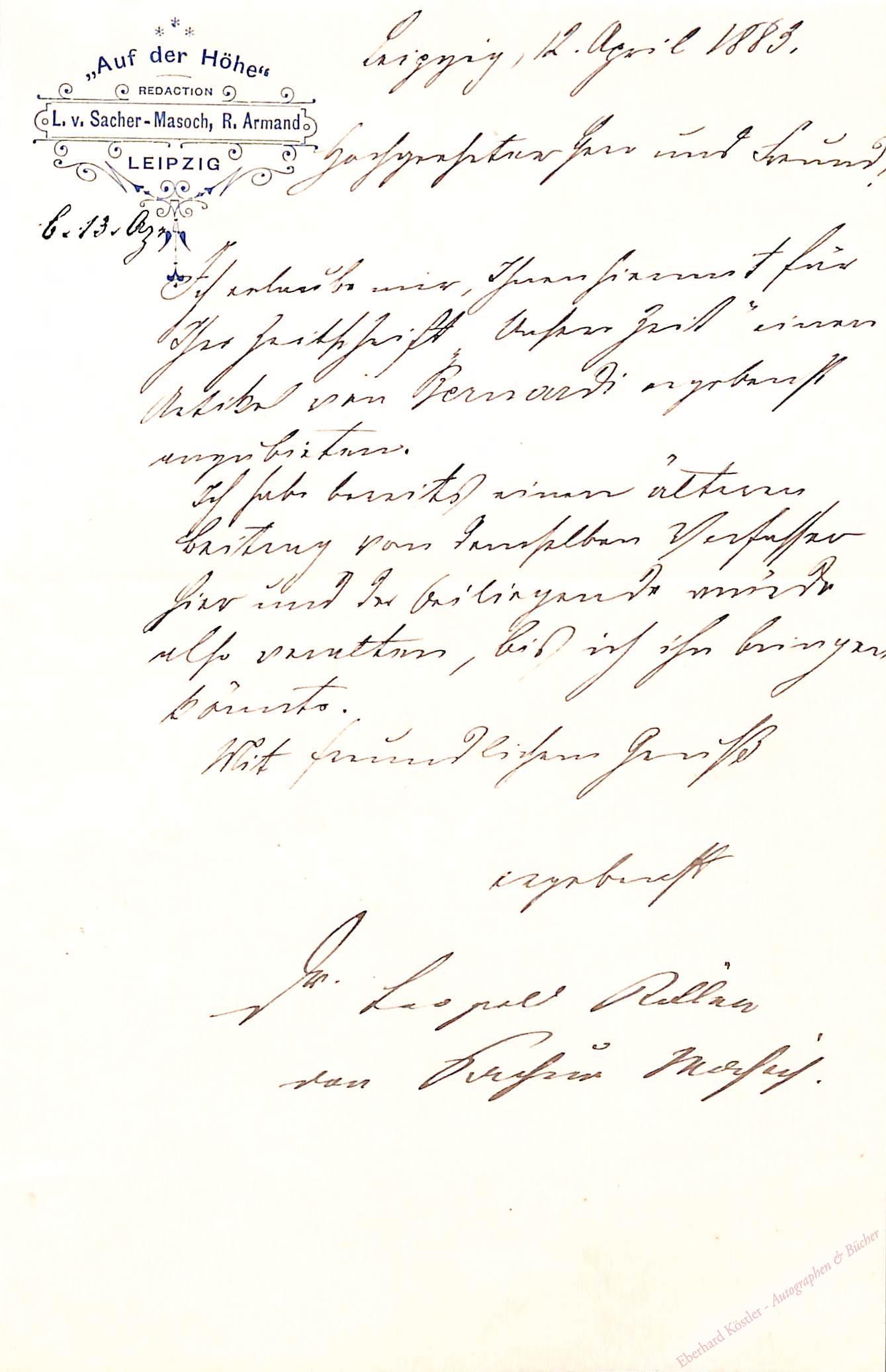 An Rudolf Gottschall (1823-1909) als Redakteur der bei Brockhaus erscheinenden Zeitschrift „Unsere Zeit“. Übersendet einen Artikel von Bernardi.