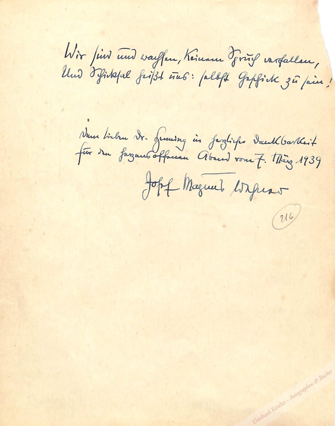 „Alle Brücken sind heilig, und auf jeder steht ein Nepomuk.“ – Rückseitig: Wehner, Josef Magnus, Schriftsteller (1891-1973). Dasselbe. 7. III. 1939. Für Dr. Henning.
