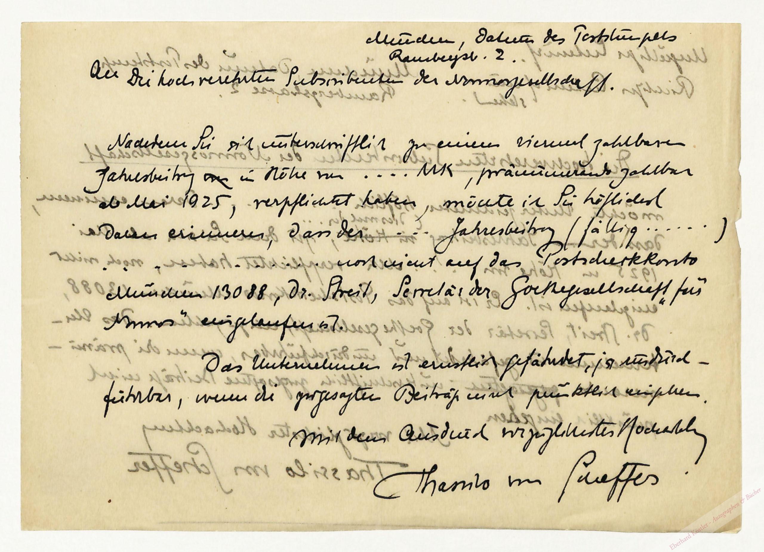 Entwurf für einen Rundbrief an die Subskribenten der Nomosgesellschaft mit der Bitte, den Jahresbeitrag auf das Postscheckkonto einzuzahlen.
