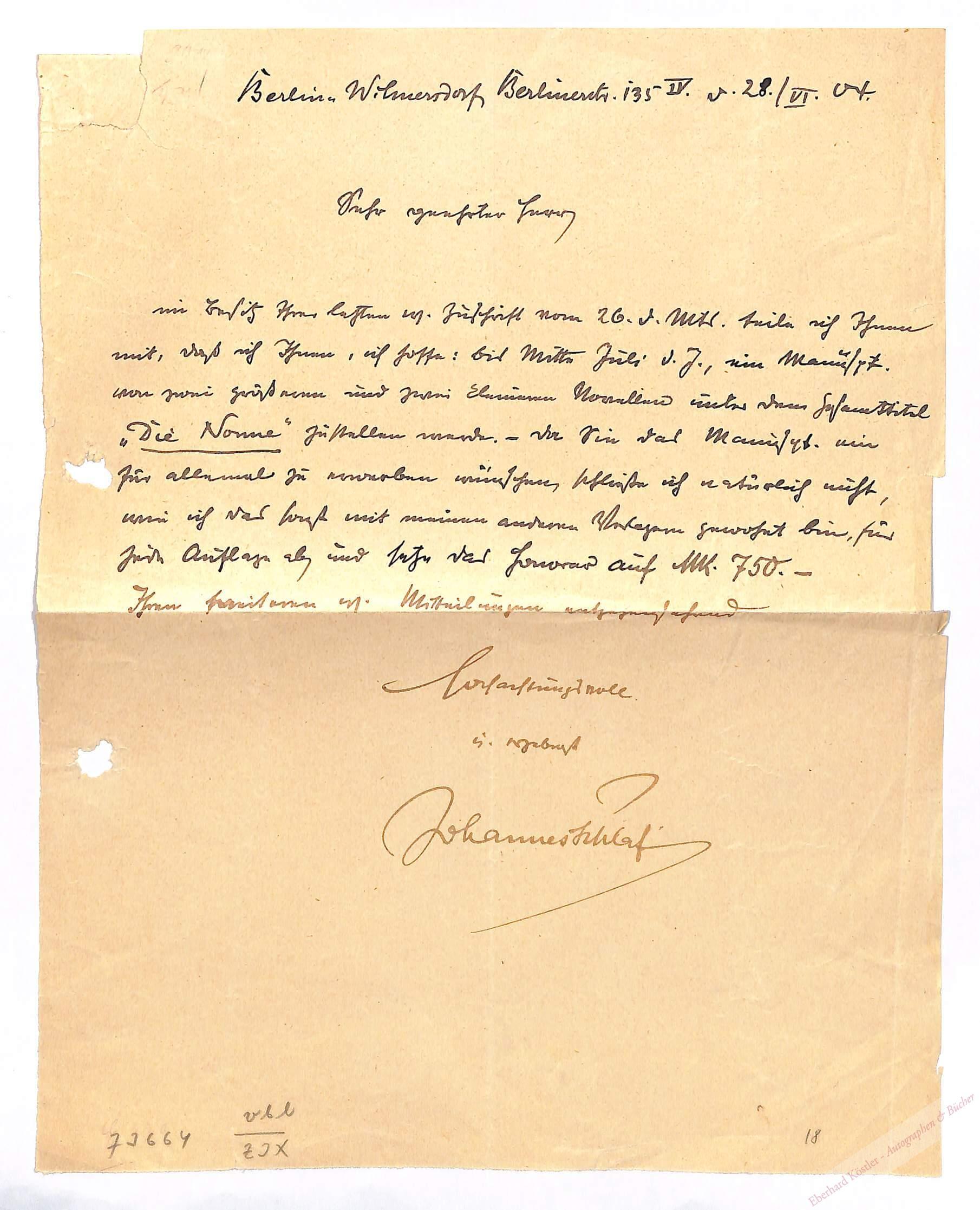 An einen Verleger, dem er verspricht, „bis Mitte Juli d. J. ein Manus[kri]pt von zwei größeren und zwei kleineren Novellen unter dem Gesamttitel ‚Die Nonne'“ zu senden. Als Honorar bestimmt er 750.- Mark. – Das Buch erschien 1905 im Wiener Verlag (Wilpert-G. 26). – Papierbedingt gebräunt. Eckeinriss.
