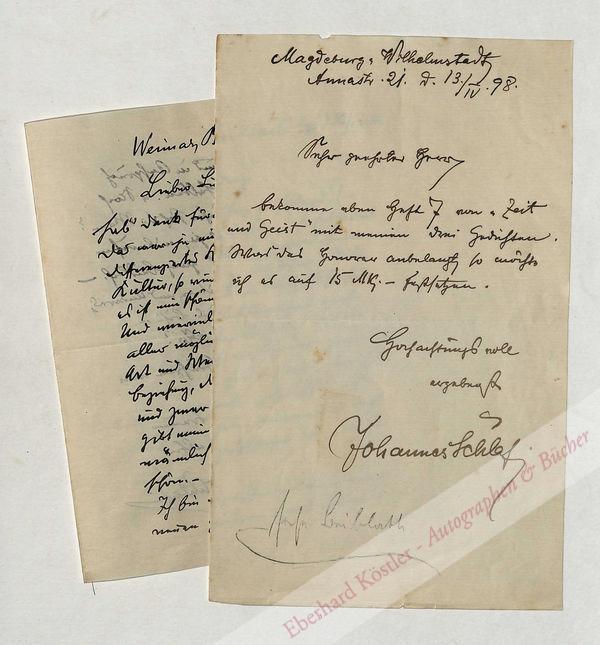 An den Schriftsteller Ludwig Bäte. – I. ber Heft 7 von „Zeit und Geist“ mit seinen drei Gedichten. – II. „[…] hab‘ Dank für ‚Herz in Holland‘! Das war ja ein Delice! Es hat so viel differenziertes Kolorit, so viel feine Kulutur, so viel in sich sicheren Stil, es ist eine schöne kleine Insichgeschlossenheit […] Und wieviel Beschlahenheit nach aller möglichen Richtung […] lch bin inzwischen mitten in einer größeren – wohl diesmal großen Arbeit. Es wird das […] Seitenstück zu ‚Das absolute Individuum und die Vollendung der Religion‘ […]“ Über seine anderen Werke, u. a. „Kosmos und kosmischer Umlauf“. – Bäte und Schlaf verband eine 25 Jahre währende, sehr innige Freundschaft, die im Jahr 1916 begann und erst mit dem Tod von Schlaf 1941 endete. Es ist überliefert, daß Bäte, als er über die schwere, den Tod bringende Krankheit Schlafs unterrichtet wurde, unvermittelt zum Bahnhof lief, um den nächsten Zug Richtung Querfurt zu nehmen, trotz Fliegeralarm und anderer Widrigkeiten. Als Bäte eintraf, lebte Schlaf zwar noch, erkannte ihn jedoch nicht mehr. – Schlaf war 1904 nach Weimar gezogen.