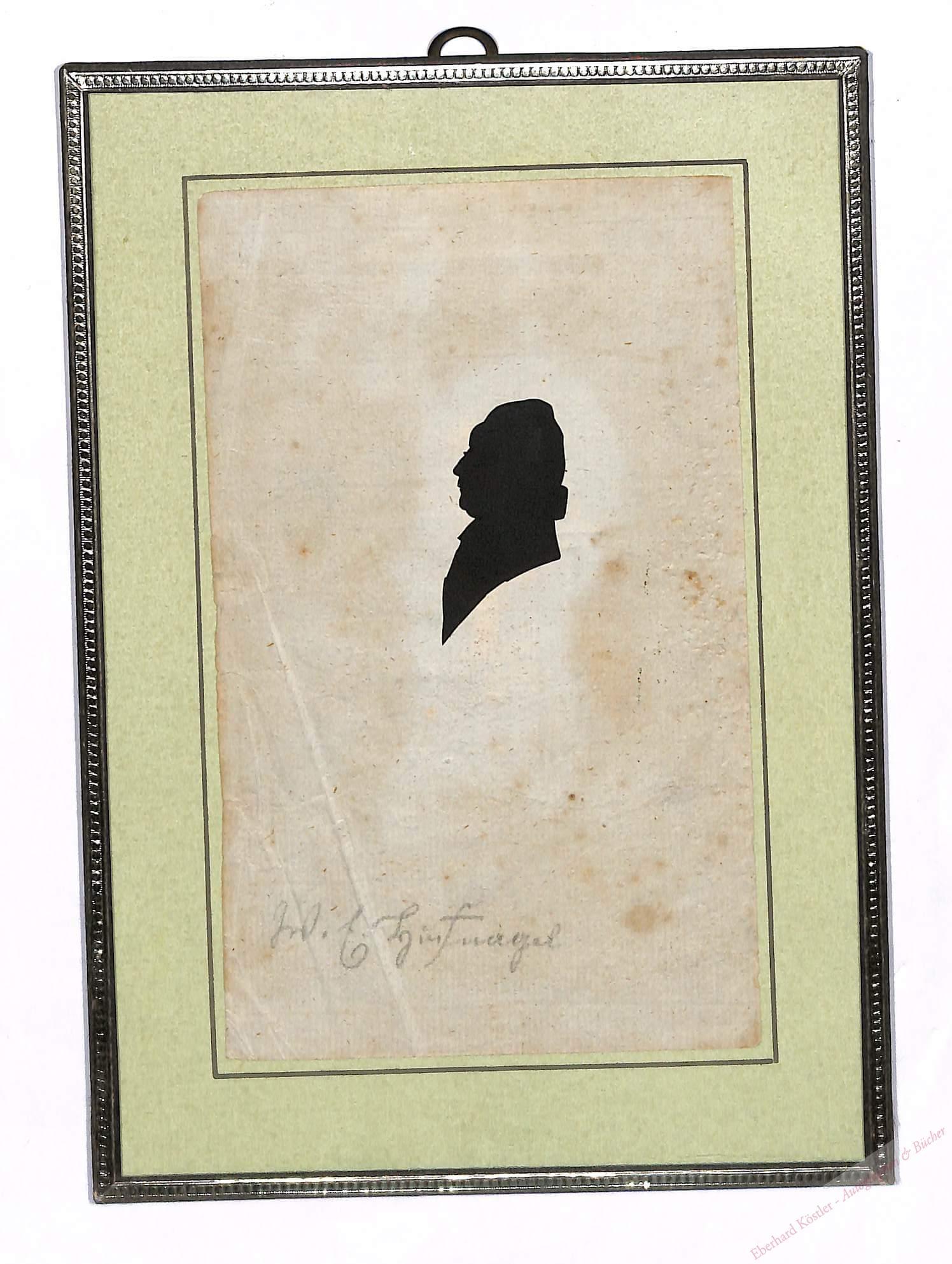 Unsere Silhouette diente möglicherweise als Vorbild eines Silhouettenstichs im Gegensinn in Zierrahmen von Heinrich Christoph Gebhard Grape (1761- 1834; Porträtsammlung der Österr. Nationalbibliothek). – Hufnagel wurde 1779 Professor in Erlangen. 1786 war er Rektor der Universität, 1788 wurde er zum Universitätsprediger und Senior des Predigerseminars ernannt. Später wirkte er in Frankfurt.