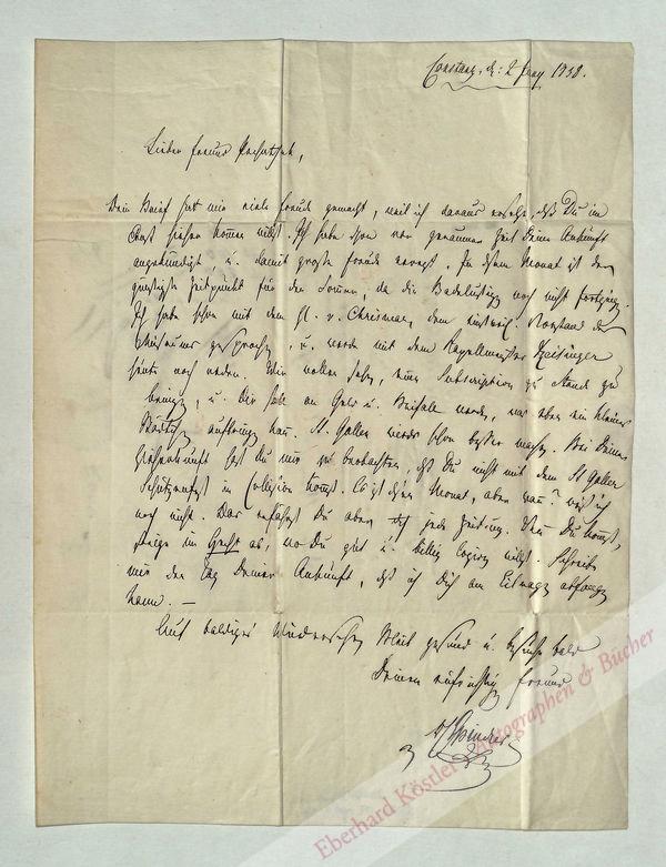 An den Violinisten und Großherzogliche Badischen Konzertmeister Franz Pechatschek (1793- 1840) in Karlsruhe über einen geplanten Besuch und ein Konzert in Konstanz. Empfiehlt das Gasthaus „Hecht“ am Fischmarkt. – Zwischen 1830 und 1860 zählte Spindler zu den populärsten Unterhaltungsschriftstellern in Deutschland.