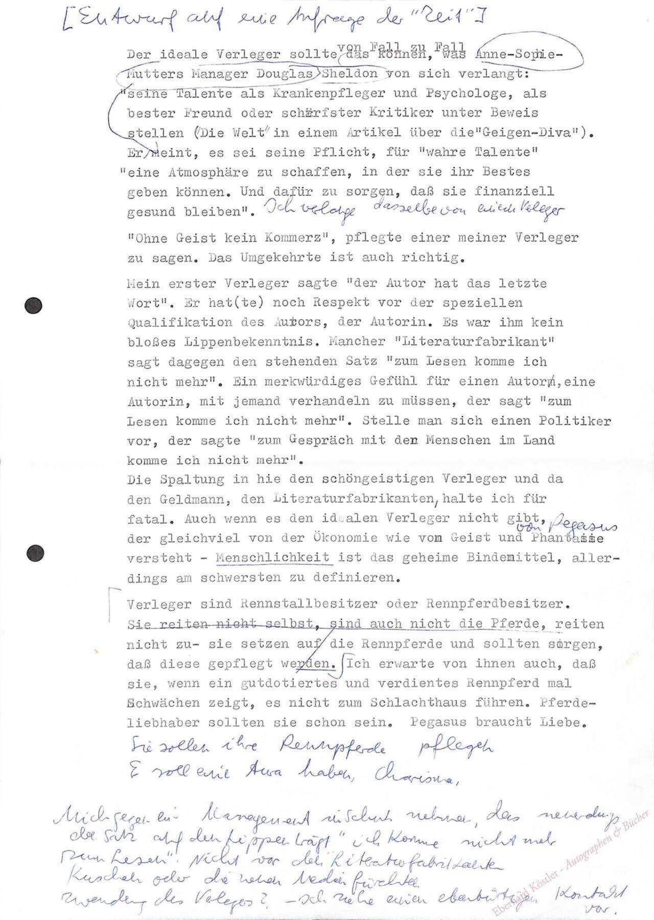 Interessantes Konvolut: I. „Entwurf auf eine Anfrage der ‚Zeit'“ über den idealen Verleger mit umfangreichen eigenh. Ergänzungen. – Gelocht. – II. „Aus ersten Entwürfen zu ‚Die Starverkäuferin'“, 3 Bl. – III. „Schreiben als ‚Eisfest‘. Karin Struck über Fritz Raddatz ‚Männerängste in der Literatur, Frau oder Kunst'“, 3 Bl. – IV. Verlagsplakert zu „Kindheitsende“. – Gefaltet und knittrig. – V. Dass. zu „Zwei Frauen“. – VI. Begleitbrief an einen Sammler und über das Sammeln. – VI. Interview aus „Weltbild“ (1996).