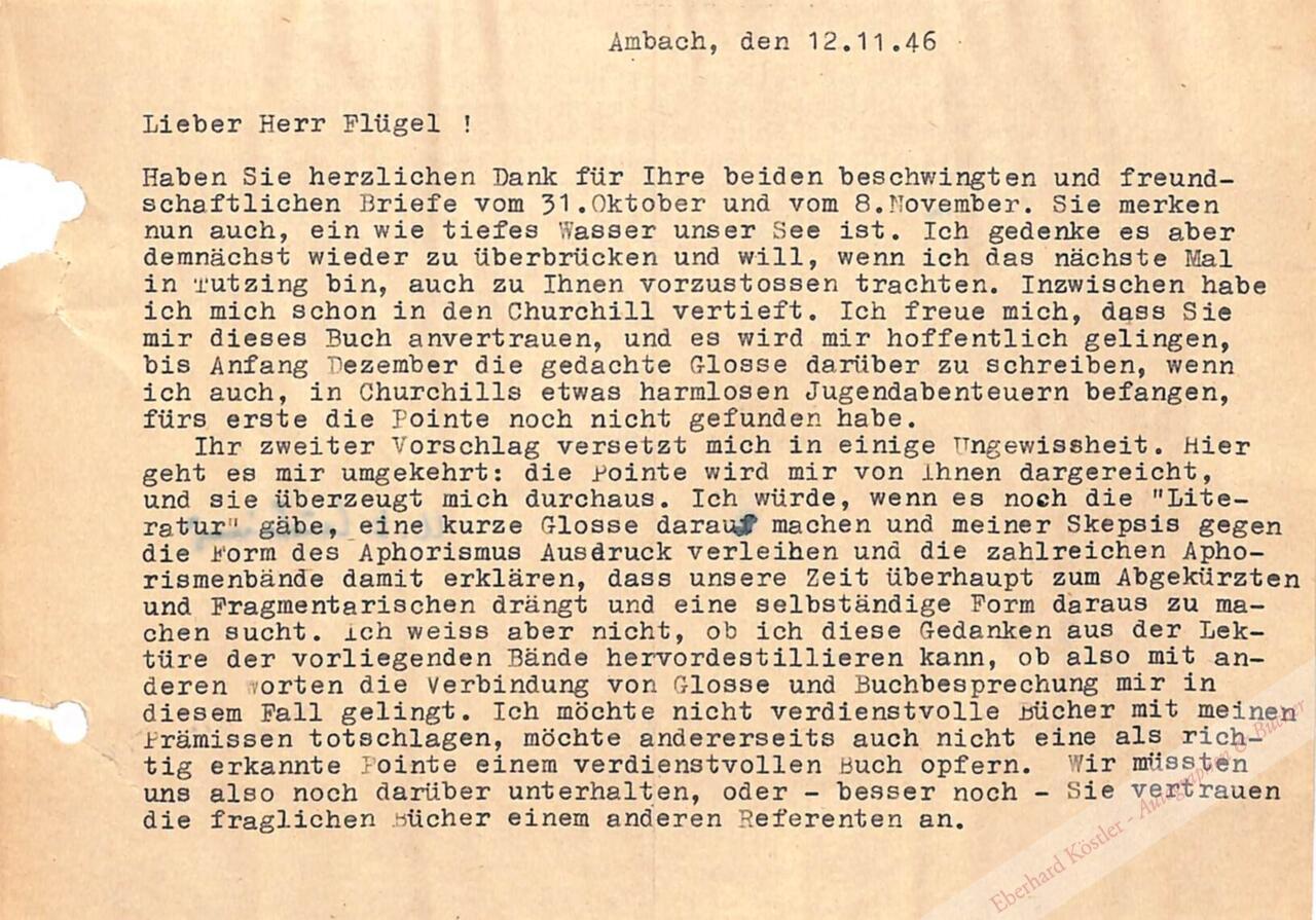 An Heinz Flügel, Redakteur der Zeitschrift „Hochland“: „… Inzwischen habe ich mich schon in den Churchill vertieft. Ich freue mich, das sSie mir dieses Buch anvertrauen, und es wird mir hoffentlich gelingen, bis Anfang Dezember die gedachte Glosse darüber zu schreiben, wenn ich auch, in Churchilss etwas harmlosen Jugendabenteuern befangen, fürs erste die Pointe noch nicht gefunden habe. Ihr zweiter Vorschlag versetzt mich in einige Ungewissheit, hier geht es mir umgekehrt: die Pointe wird mir von Ihnen dargereicht, und sie überzeugt mich durchaus. Ich würde, wenn es noch die ‚Literatur‘ gäbe, eine kurze Glosse darauf machen und meiner Skepsis gegen die Form des Aphorismus Ausdruck verleihen und die zahlreichen Aphorismenbände damit erklären, dass unsere Zeit überhaupt zum Abgekürzten und Fragmentarischen drängt und eine selbständige Frm daraus zu machen sucht …“. – Gelocht.