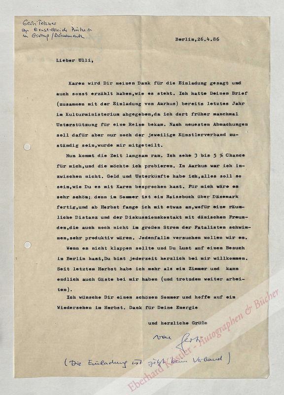 An einen Germanisten wegen einer Reise nach Dänemark und die Unterstützung durch Ministerium und Künstlerverband: „[…] Ich sehe 3 bis 5% Chance für mich, und die möchte ich probieren […]“ Erwähnt ihr Reisebuch über Dänemark „Im Lande der Fähren“ und eine größere Arbeit.