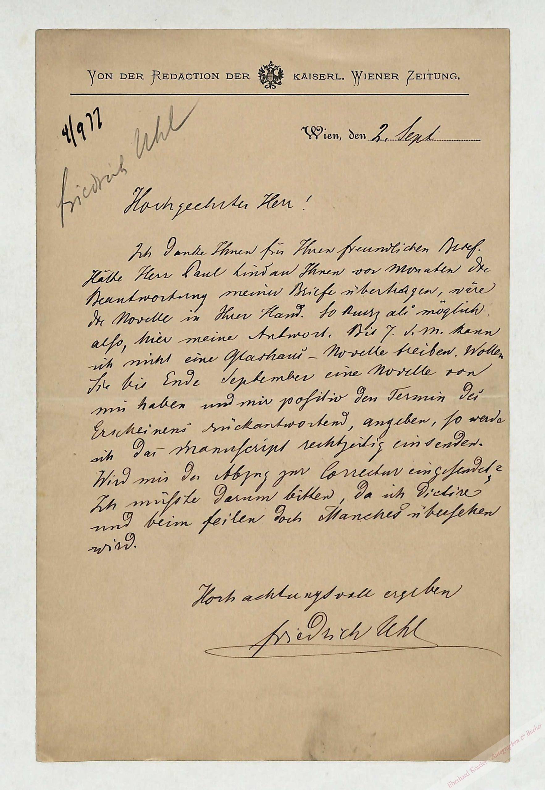An einen Redakteur wegen Einsendung einer „Glashaus-Novelle“. – Ab Oktober 1872 war Uhl Chefredakteur der Wiener Zeitung, für die er unter anderem zahlreiche Feuilletons sowie Theater- und Opernkritiken schrieb. Die Neptunfigur des Brunnens Macht zur See an der Fassade des Michaelertrakts der Hofburg soll das Konterfei von Friedrich Uhl zeigen.