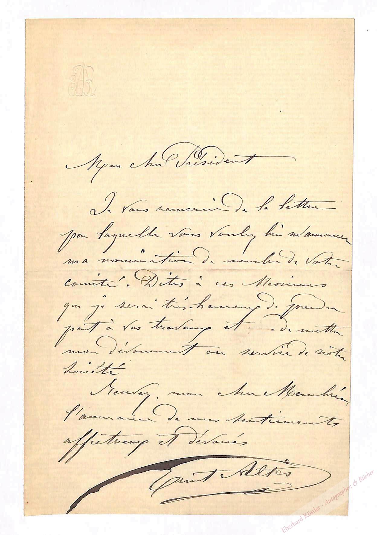An einen Präsidenten, dem er für die Nominierung in ein Kommittee dankt, bei dem er gerne mitarbeiten will. – Französisch. – Ab 1871 war Altès stellvertretender Dirigent der Pariser Oper. Im Jahr 1881 wurde er Mitglied der Ehrenlegion.