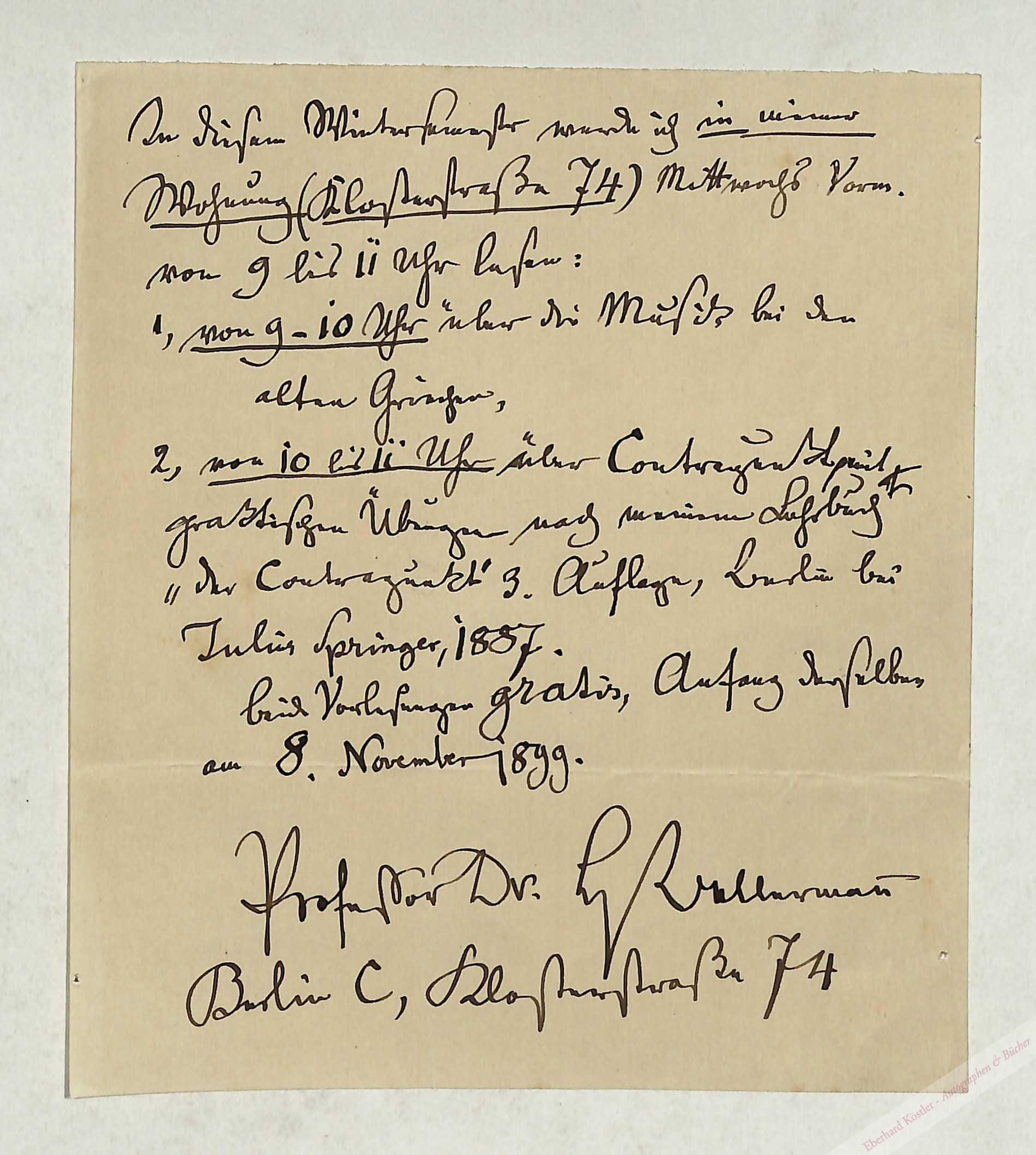 „In diesem Wintersemester werde ich in meiner Wohnung (Klosterstraße 74) Mittwochs Vorm. von 9 bis 11 Uhr lesen: 1, von 9-10 Uhr über die Musik bei den alten Griechen, 2, von 10 bis 11 Uhr über Contrapunkt, mit praktischen Übungen nach meinem Lehrbuch ‚der Contrapunkt‘ 3. Auflage, Berlin bei Julius Springer, 1887. Beide Vorlesungen gratis, Anfang derselben am 8. November 1899…“