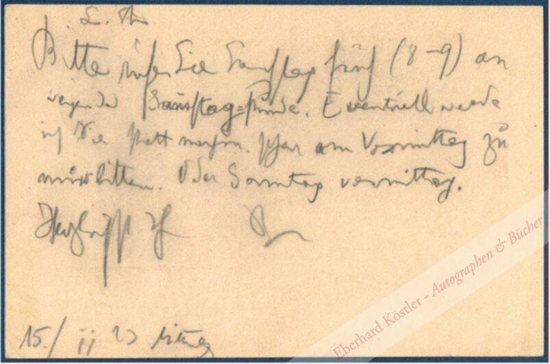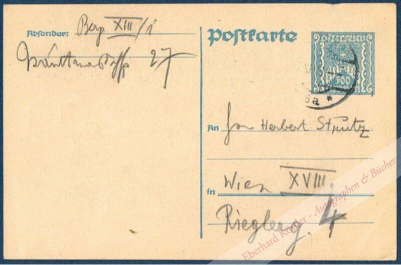 An seinen Schüler Herbert Strutz (1902-1973) in Wien, Rieglergasse 4: „“L[ieber] Str[utz] | Bitte rufen Sie Samstag früh (8-9) an wegen der Samstag-Stunde. Eventuell werde ich Sie statt nachm[ittag] schon am Vormittag zu mir bitten. Oder Sonntag vormittag. Herzlichst Ihr B[er]g.“ – Strutz studierte nach einer Buchhändlerlehre Komposition bei Alban Berg und war als Pianist, Komponist und Klavierlehrer tätig. Wegen einer „überspielten“ linken Hand wandte er sich ab 1923 dem Journalismus zu. Seit 1934 war er Lektor im Österreichischen Bundesverlag, daneben Redakteur der Kulturzeitschrift „Österreichische Rundschau“. 1945 wurde er Kunstkritiker der „Kärntner Volkszeitung“ in Klagenfurt. – Leichte Wischspuren.
