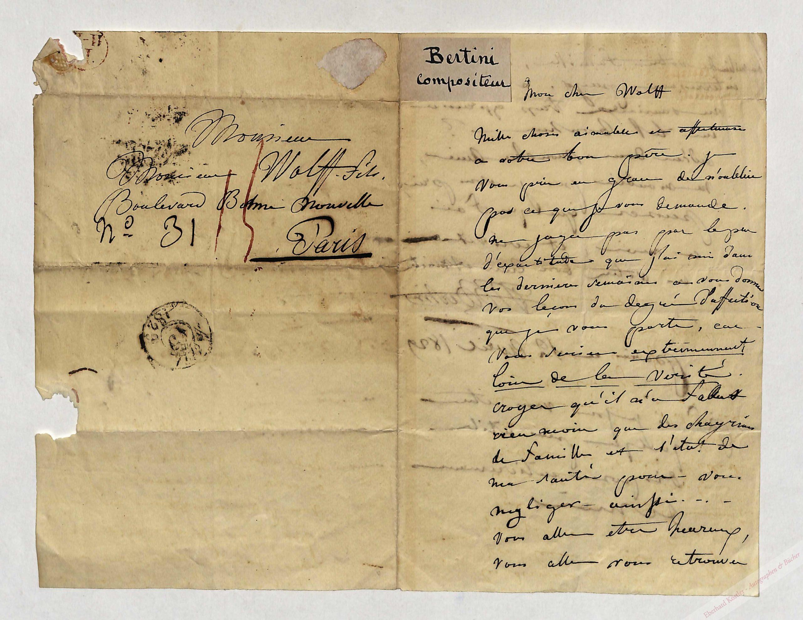 An seinen Schüler Wolff mit Bedauern, ihn vernachlässigt zu haben. „… des chagrins de famille et l´etat de ma santé… ne m´oubliez pas… votre bon ami et maitre…“ Das Klavierschaffen Bertinis fand hohe Anerkennung von Robert Schumann.