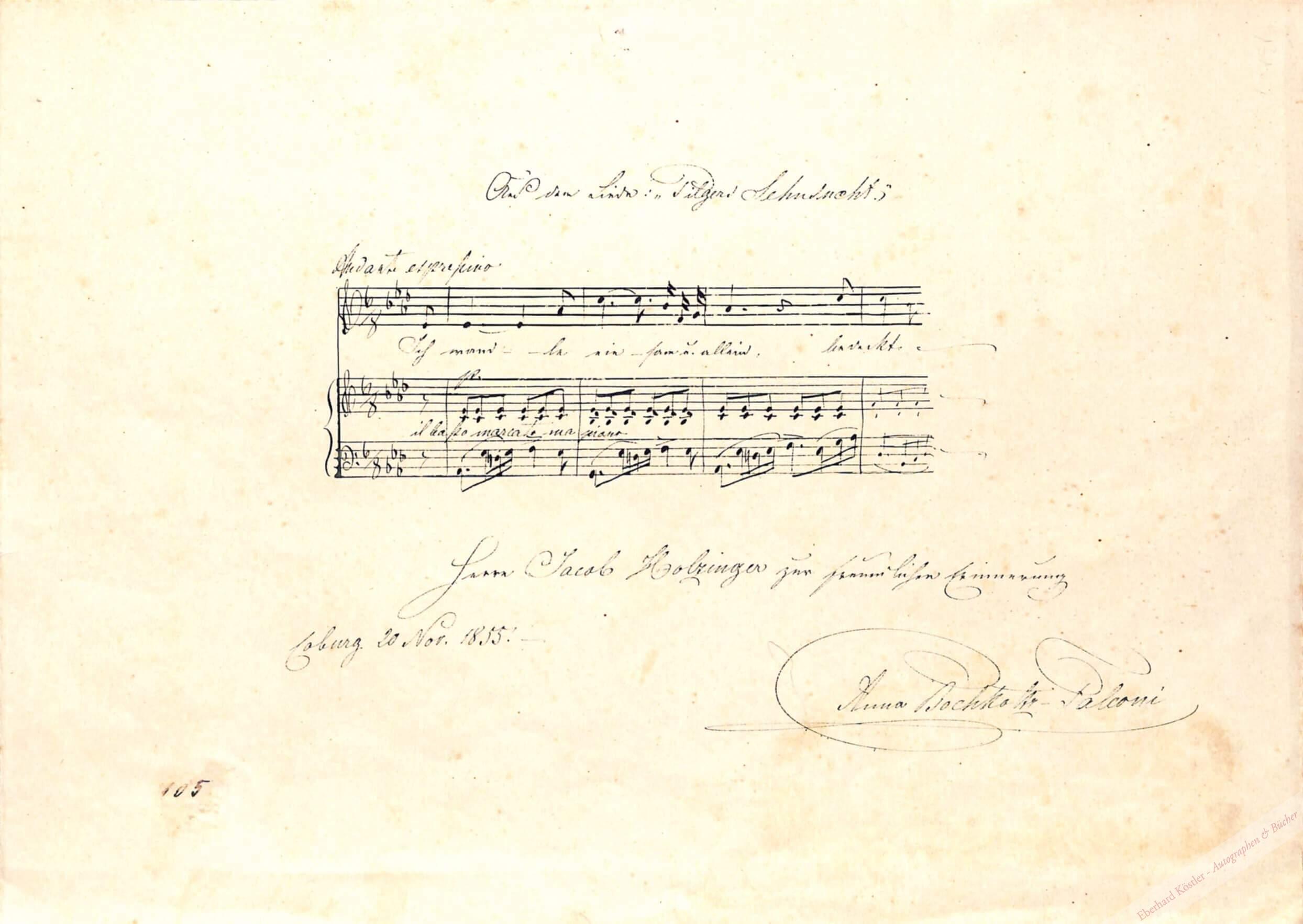 Die fünf Anfangstakte „Aus dem Liede: Pilgers Sehnsucht“ mit Gesang und Klavierstimme: “ … Ich wandle einsam und allein … Herrn Jacob Holzinger zur freundlichen Erinnerung …“.